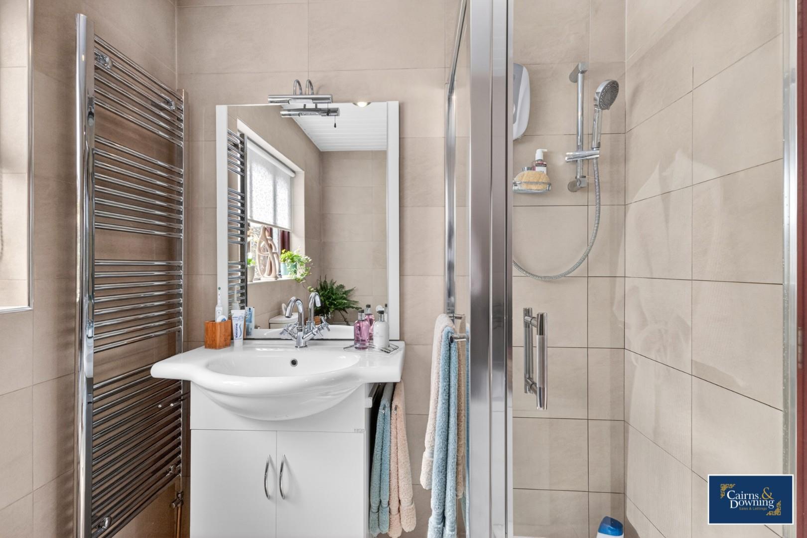 A modernised bathroom with separate bath & shower unit. Wash hand basin & toilet. Tiled walls and floor & window to the rear