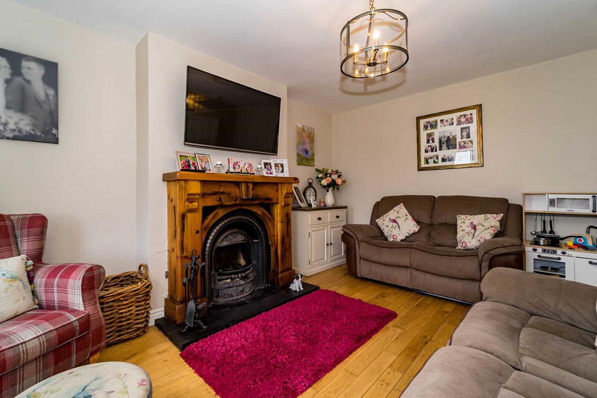Feature fireplace with cast iron inset, tiled hearth and wooden surround. Oak flooring.