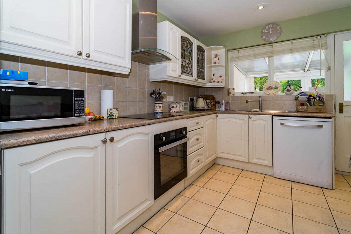 Range of high and low level units in cream. Large and small bowl stainless steel sink unit with mixer tap. Built-in oven, 4 ring ceramic hob and extractor unit in stainless steel over. Space for fridge/freezer. Plumbed for dishwasher.