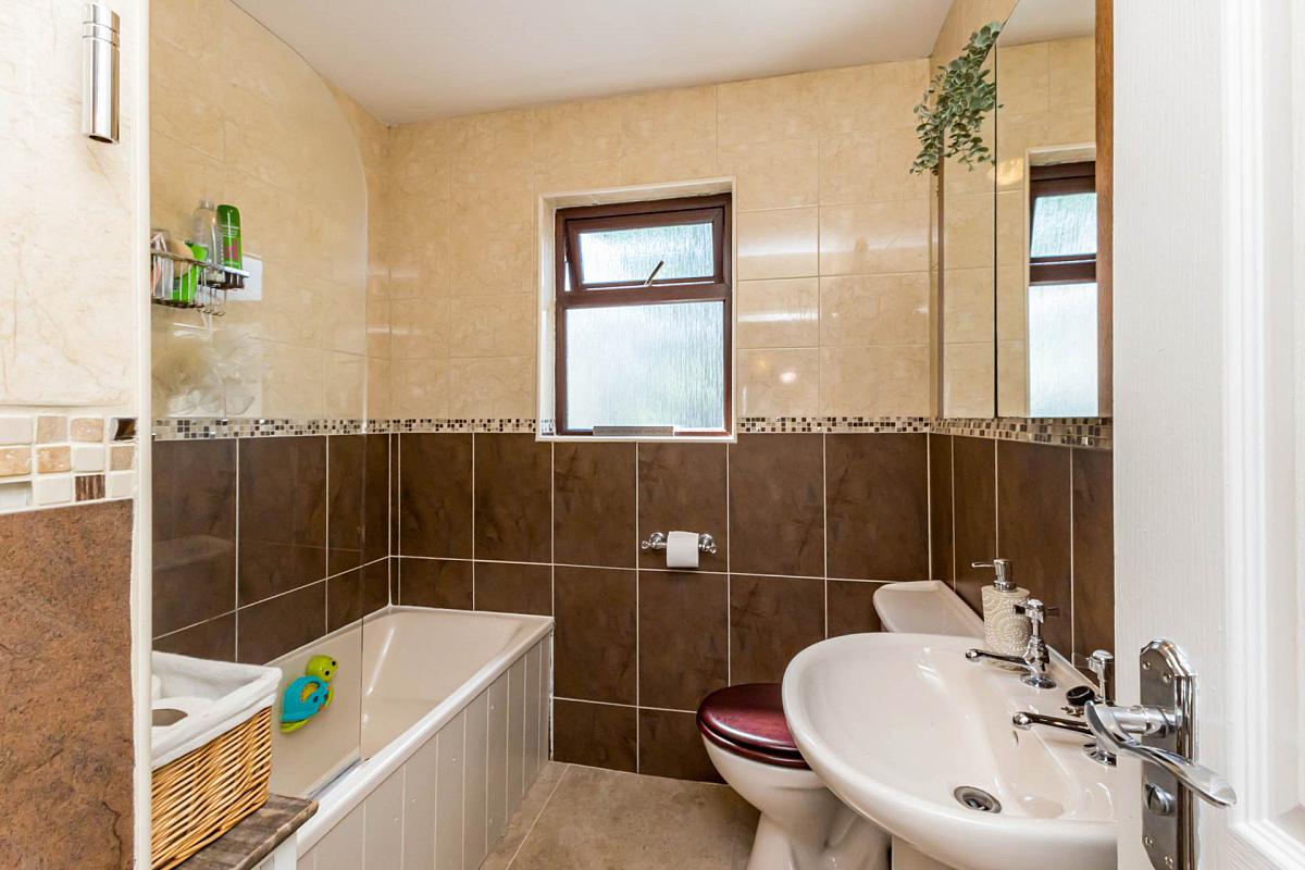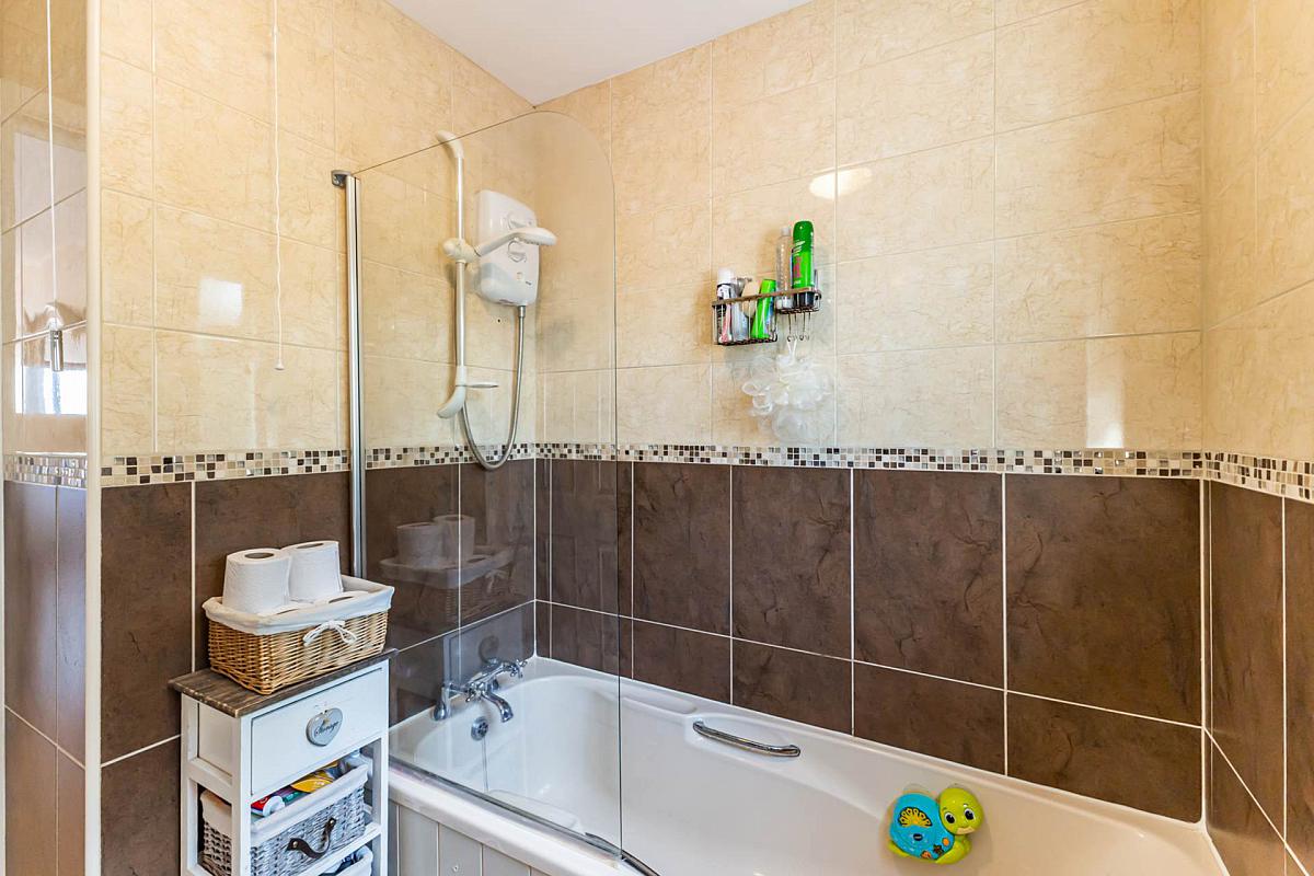 Cream suite to include bath with electric shower over and shower screen; pedestal wash hand basin; and w.c. Fully tiled walls. Tiled floor. Heated towel rail.