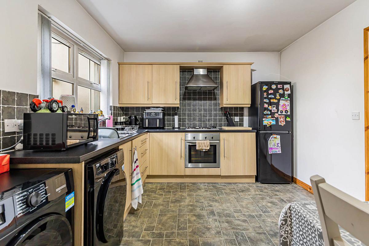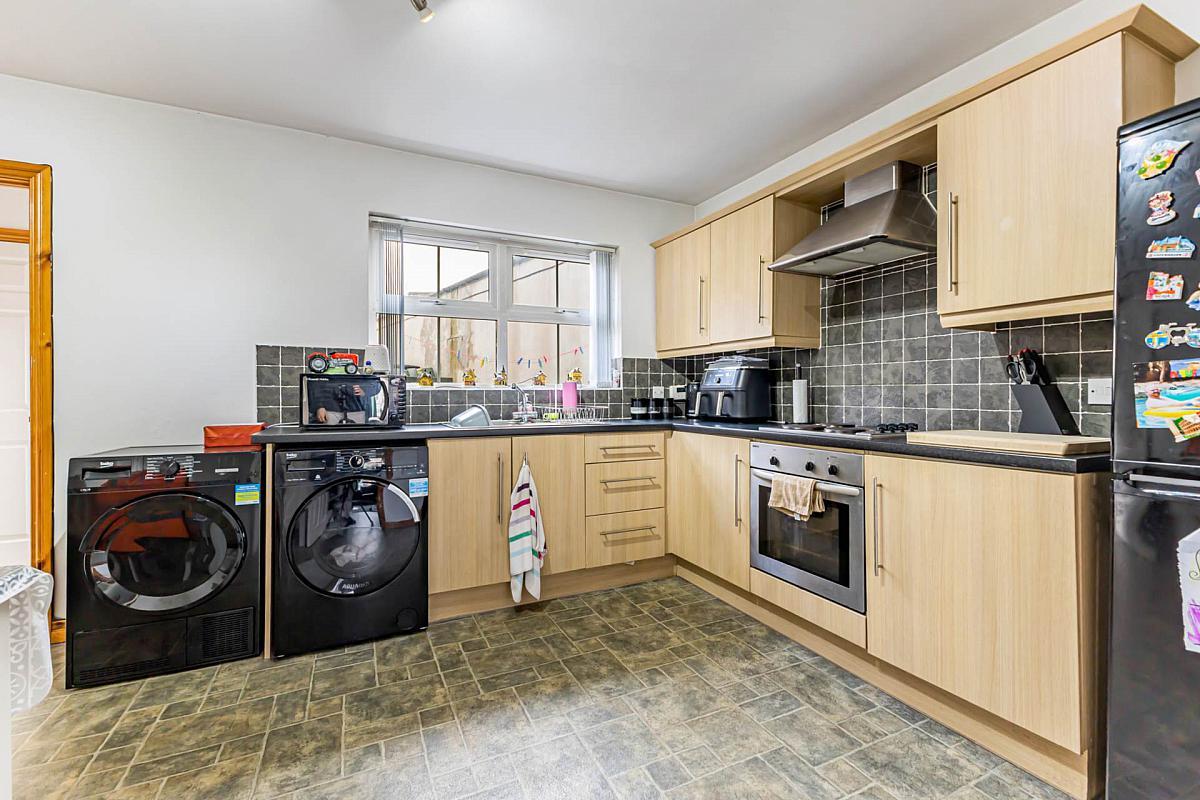 Range of high and low level units. Single drainer stainless steel sink unit with mixer tap. Built-in oven, 4 ring hob and extractor unit over in stainless steel. Plumbed for washing machine. Part tiled walls.