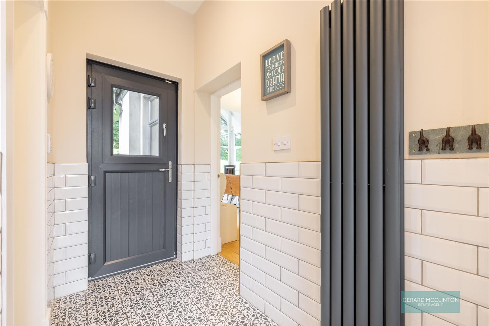 Door to rear, window to front, attractive tiled flooring, range of wall and base units, "Belfast" sink with brass mixer tap, bespoke storage and cloaks area, plumbed and space for washing machine and tumble dryer, spotlights