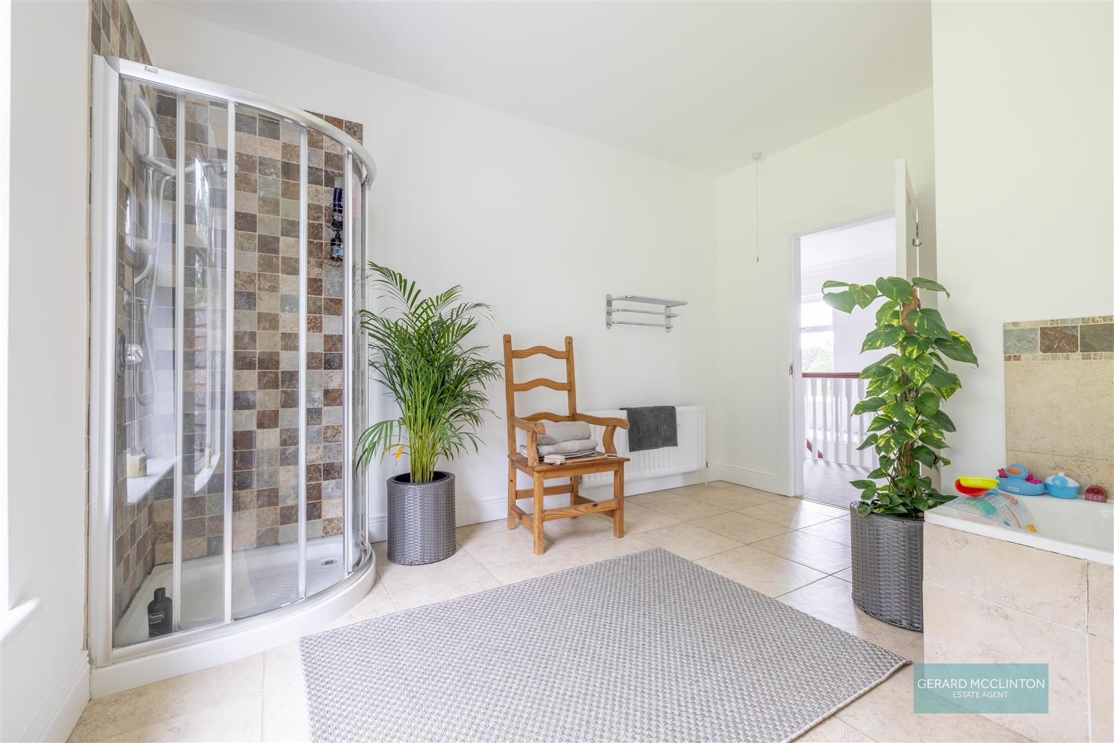 A generously proportioned family bathroom with both bath and shower, the shower is a corner unit with thermostatic shower, bath with mixer taps and shower attachment, pedestal wash hand basin and wc. Window to rear, part tiled walls, tiled floor,