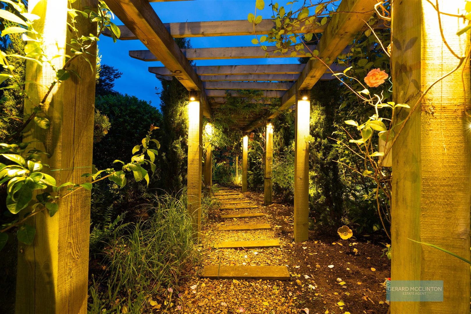 A bespoke pergola walkway elegantly connects the garden to the paddock, adding a touch of romance and structure to the grounds. As evening falls, discreetly positioned exterior lighting casts a soft glow across the architecture and landscape, allowing the property´s finest features to shine, day or night.