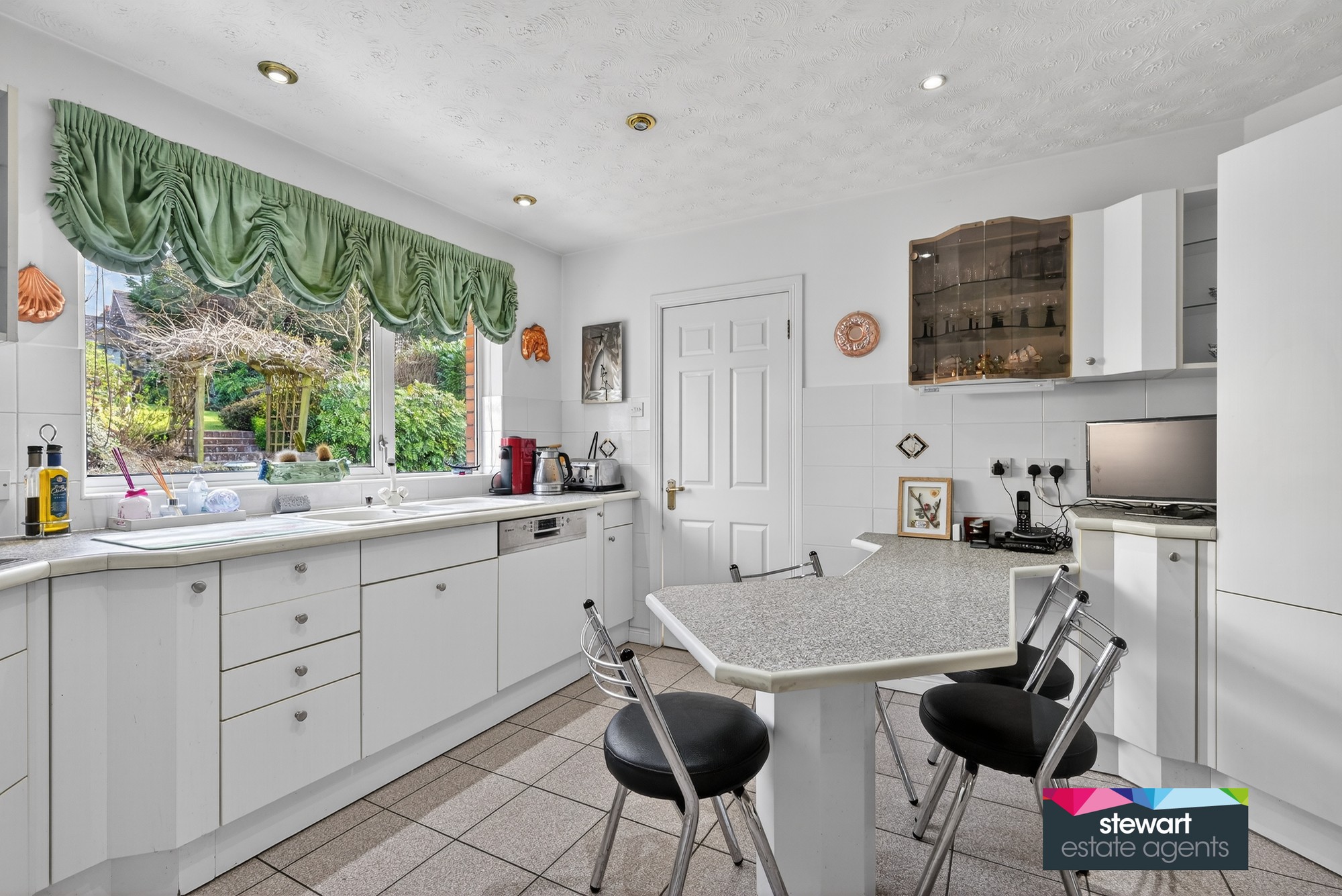 Modern style kitchen with a generous range of fitted high and low level cabinetry including a built in oven, built in microwave and a corner cooking area with an inset hob and extractor fan above. Built in dish washer. Built in dining table. Connecting door to the utility room
