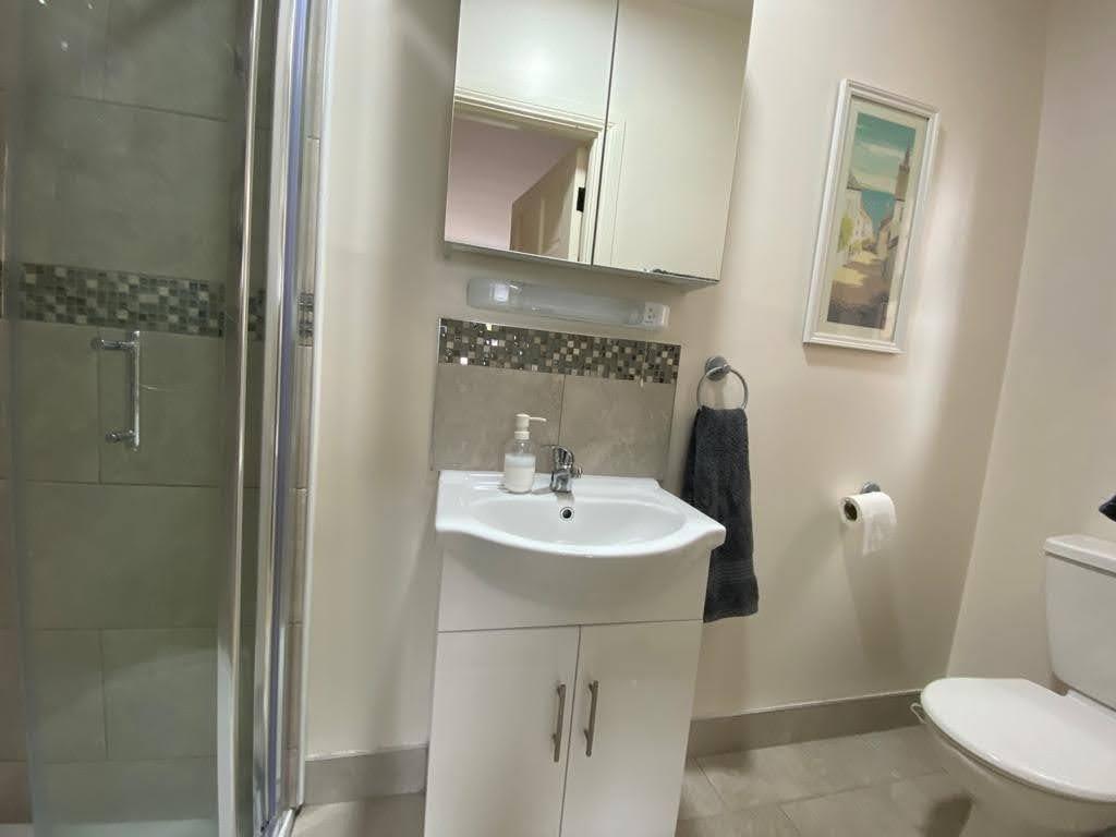Comprising fully tiled walk in shower, whb set in vanity unit, wc, tiled floor.