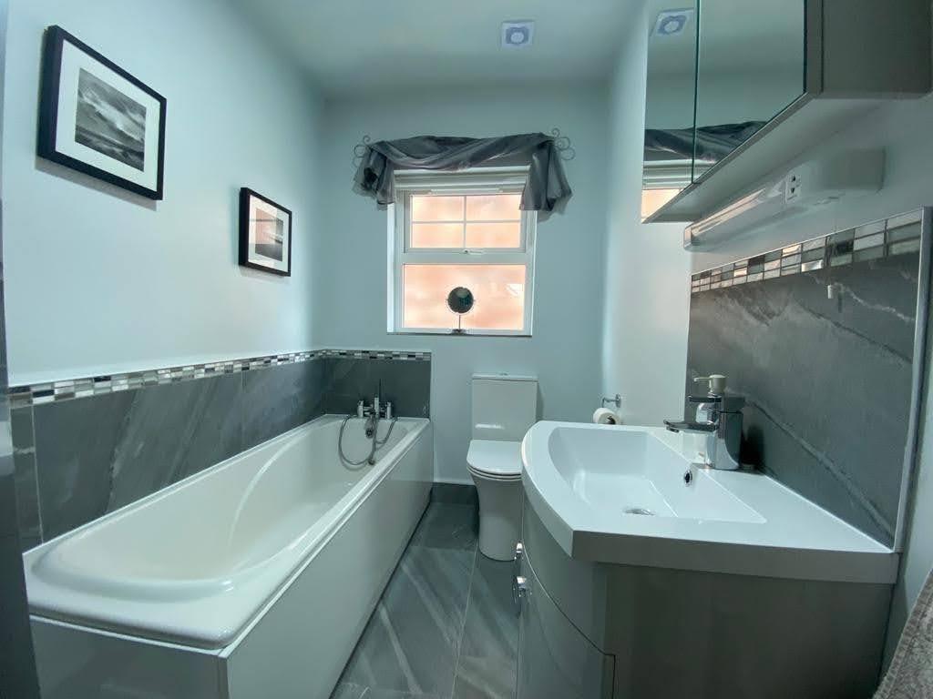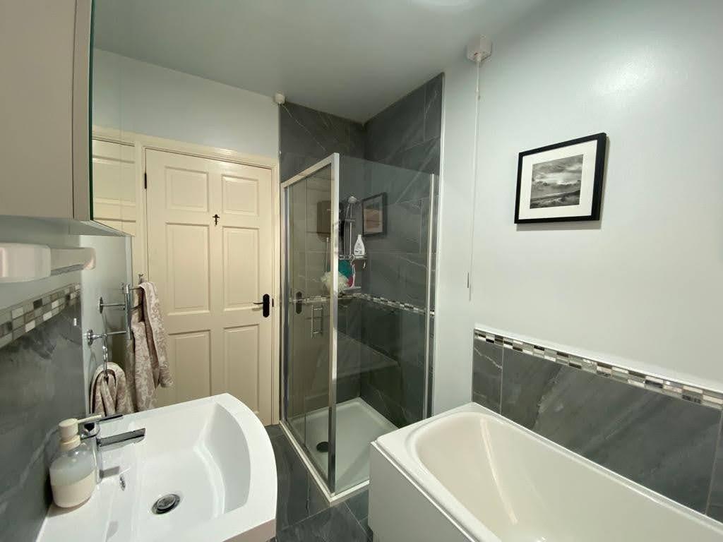 Comprising bath with shower fitting to taps, fully tiled walk in electric shower, whb set in vanity unit, wc, tiled floor.