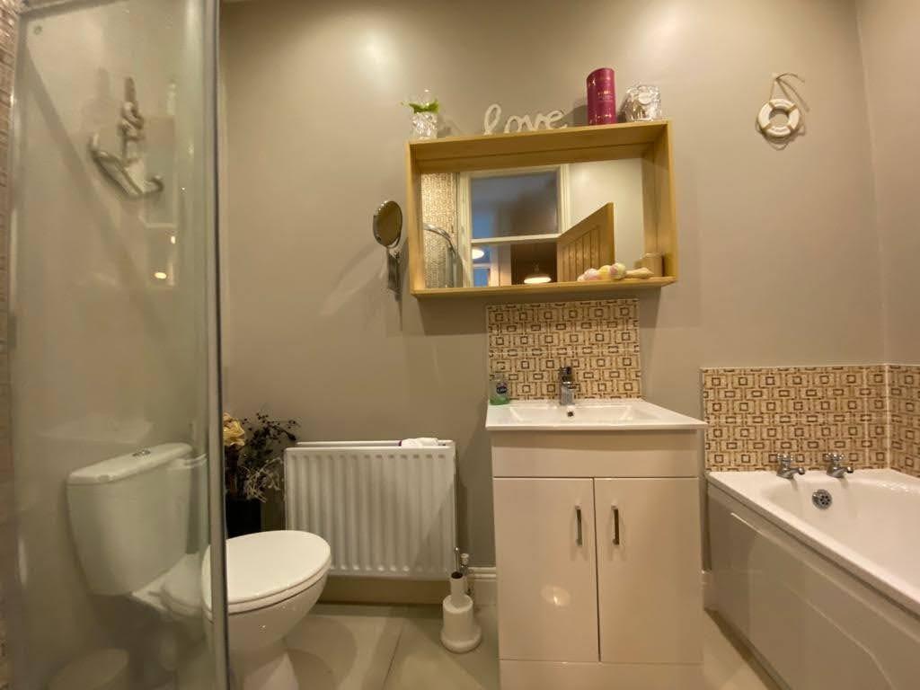 Comprising bath, whb set in vanity unit, wc, fully tiled walk in shower, tiled floor.