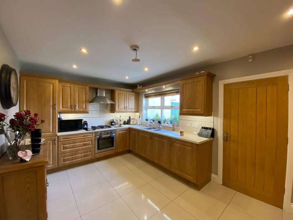 Having range of eye and low level units, tiling between units, gas hob, electric underoven, stainless steel extractor hood, integrated fridge / freezer and dishwasher, ample dining space, recessed ceiling lighting, tiled floor.