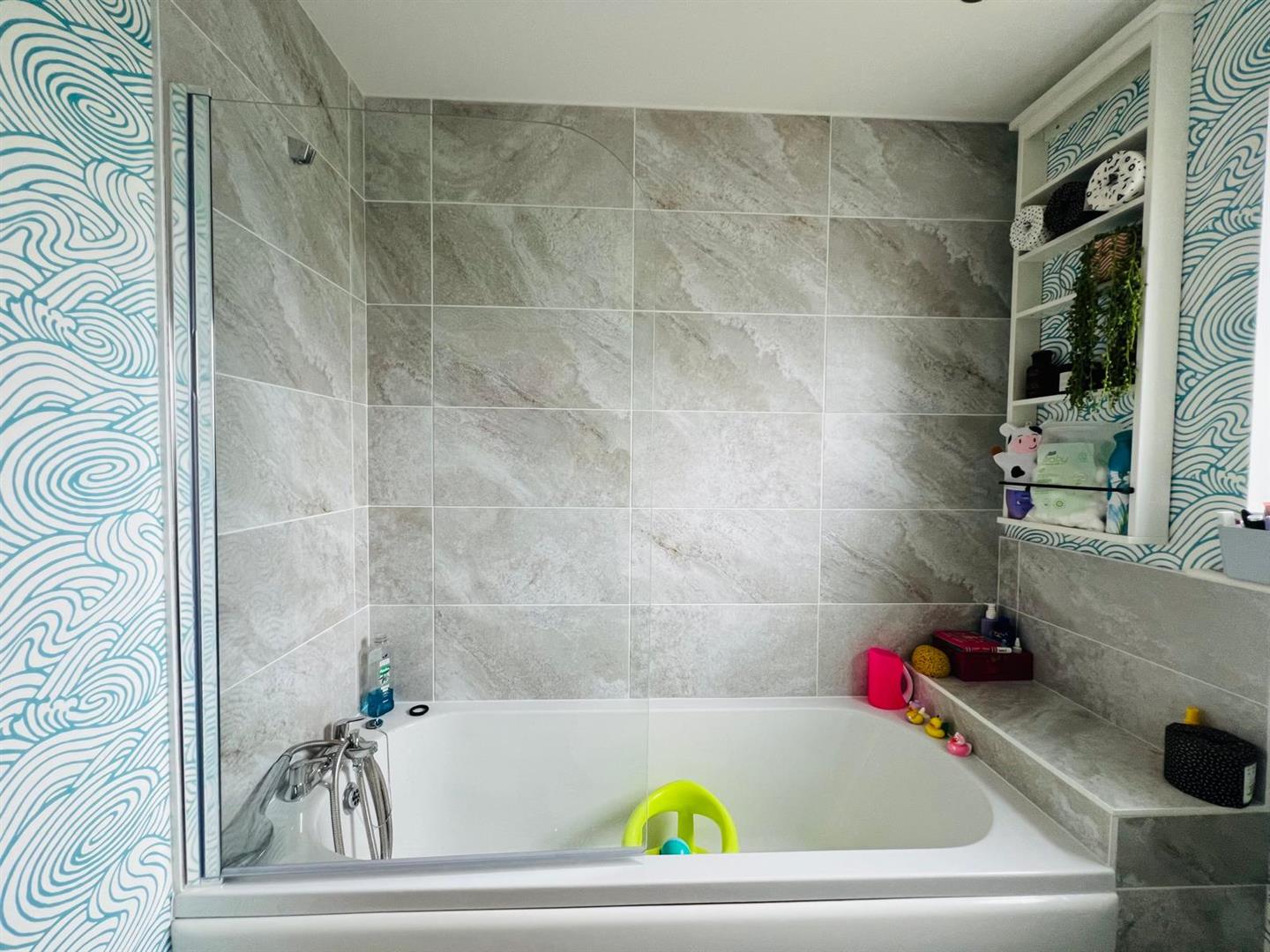 Comprising bath with telephone hand shower attachment to taps and tiling around, shower screen, whb and wc, recessed lighting, tiled floor.