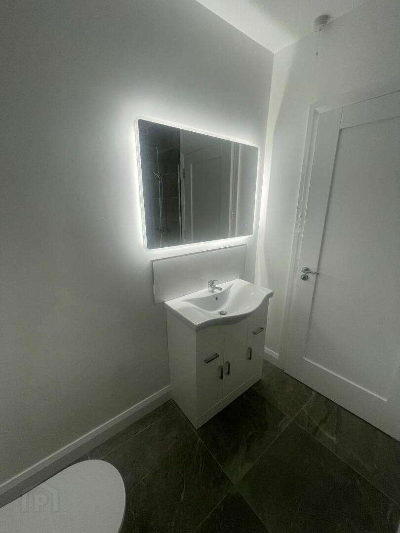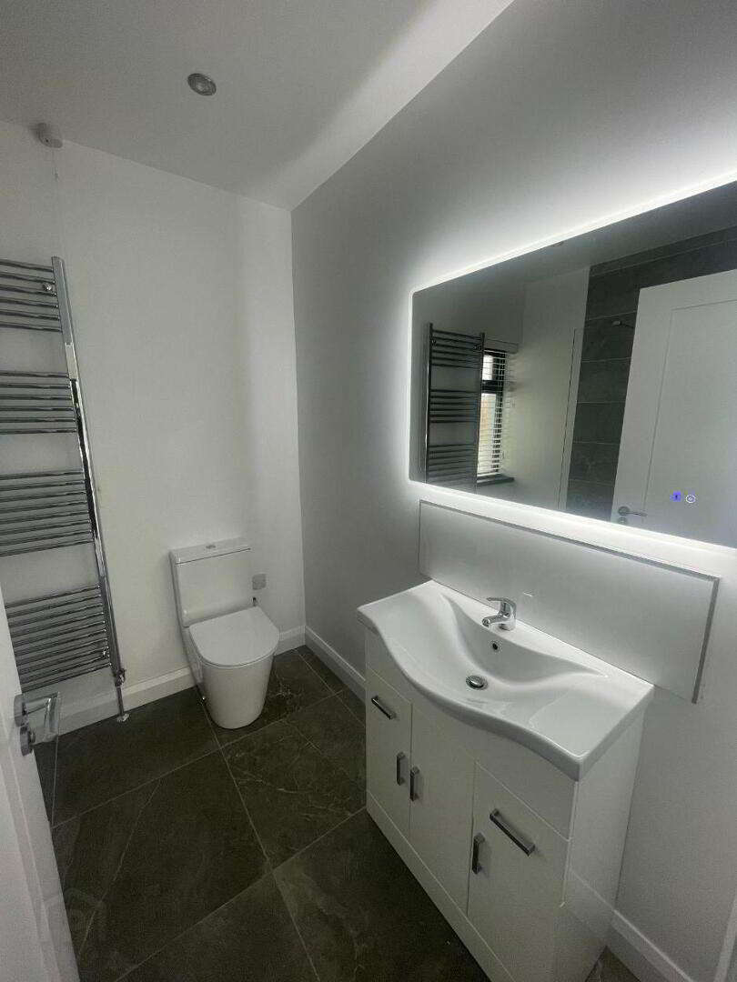 Stylish tiled floor, fitted vanity unit with wash hand basin and touch-control mirror, WC, luxury double glass shower with rainfall shower head and chrome fittings, heated towel rail, and vertical blinds.