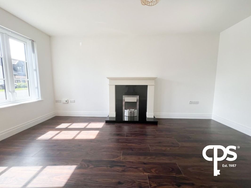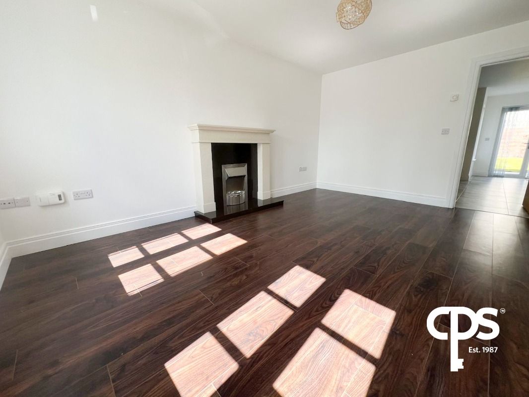 Living room - 4.8m x 3.7 m, high quality laminate floor covering, sand stone effect fireplace