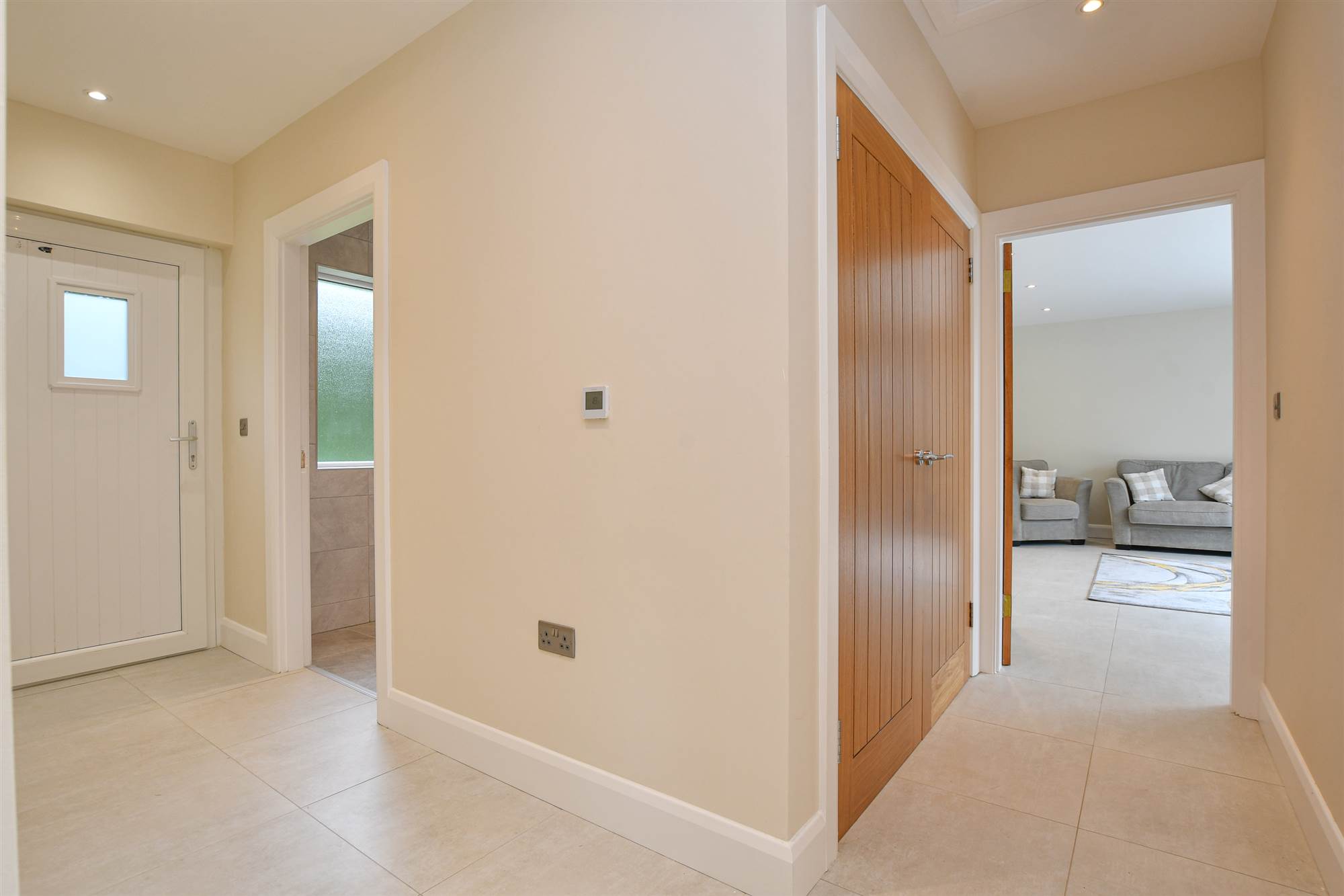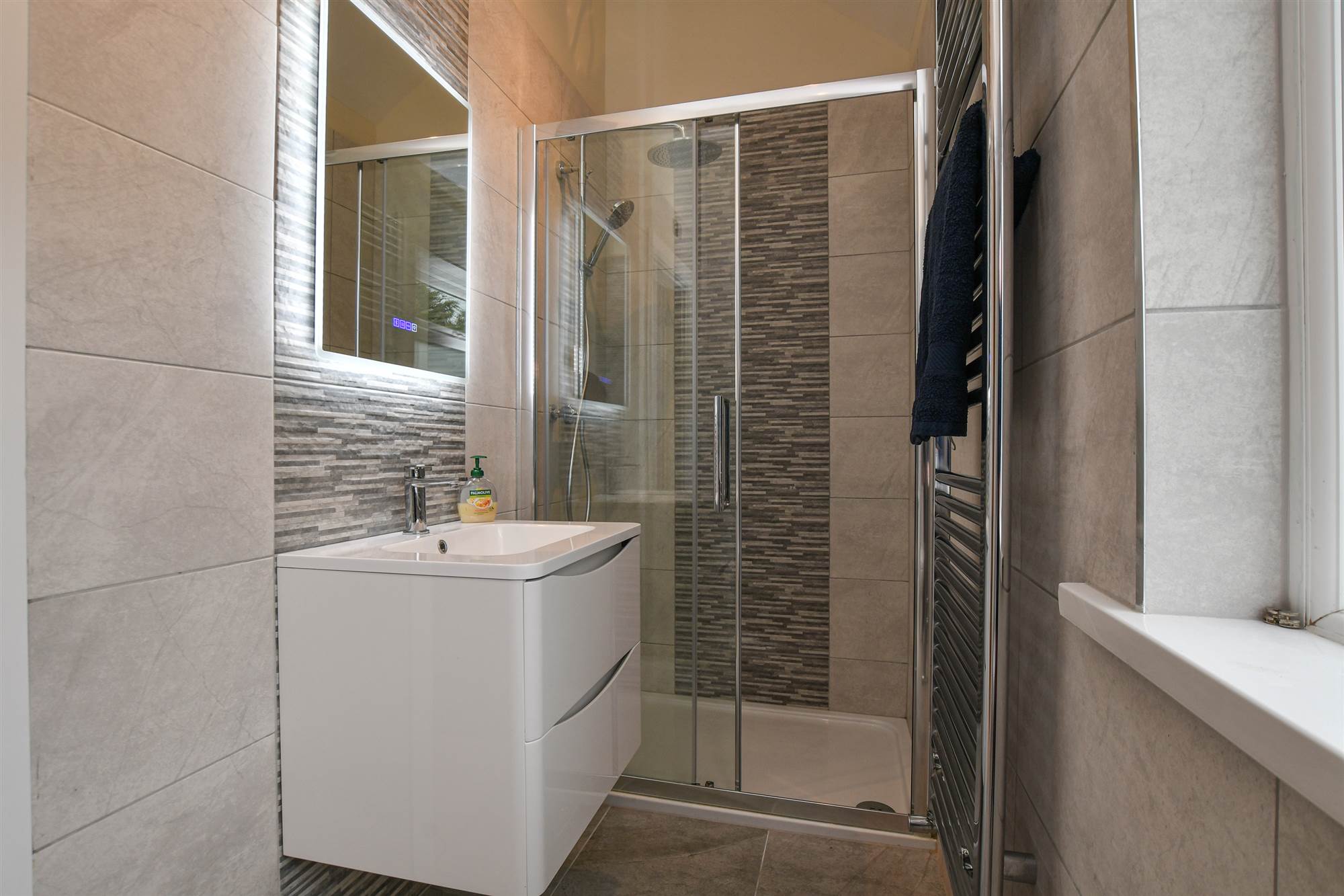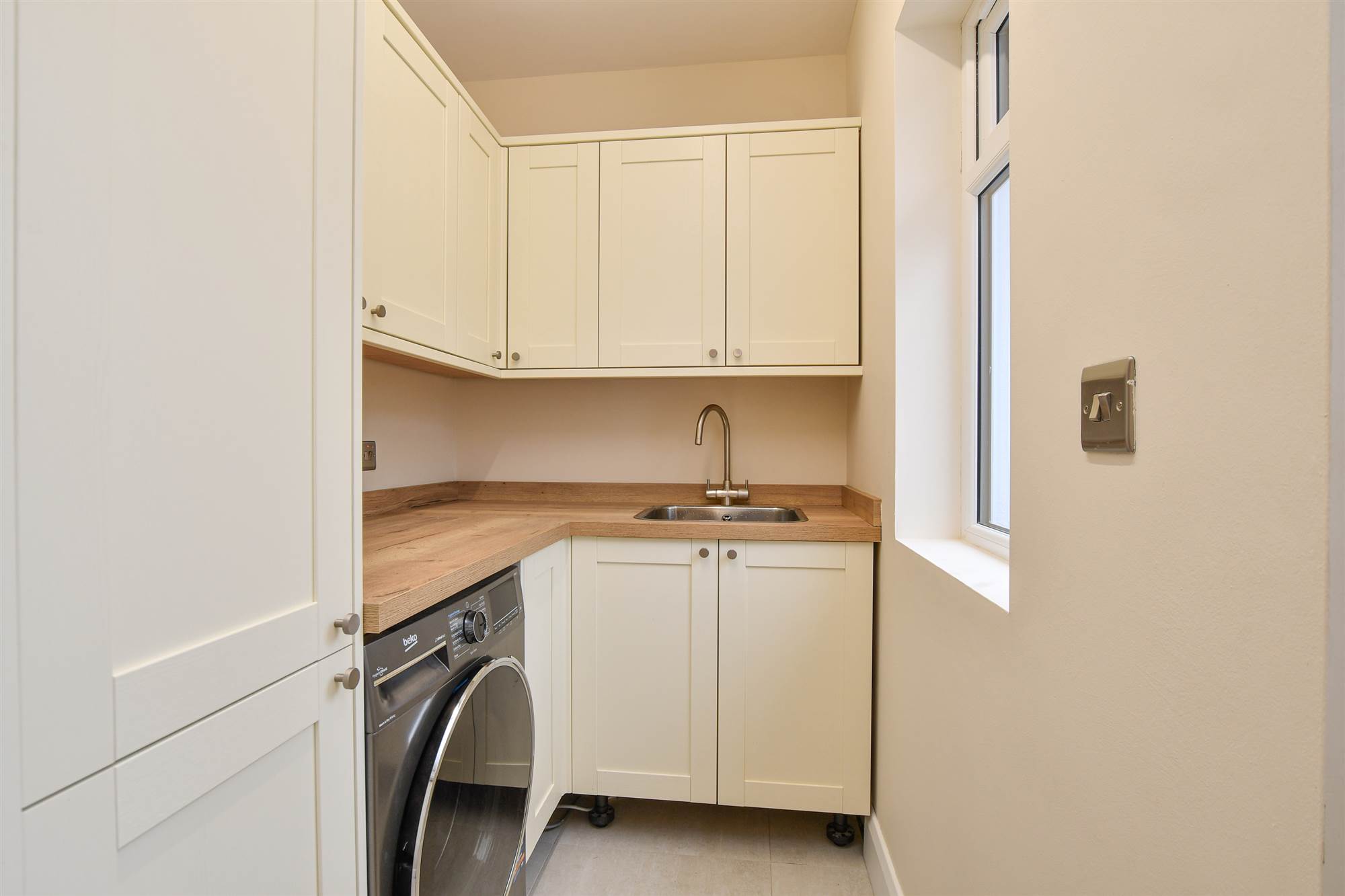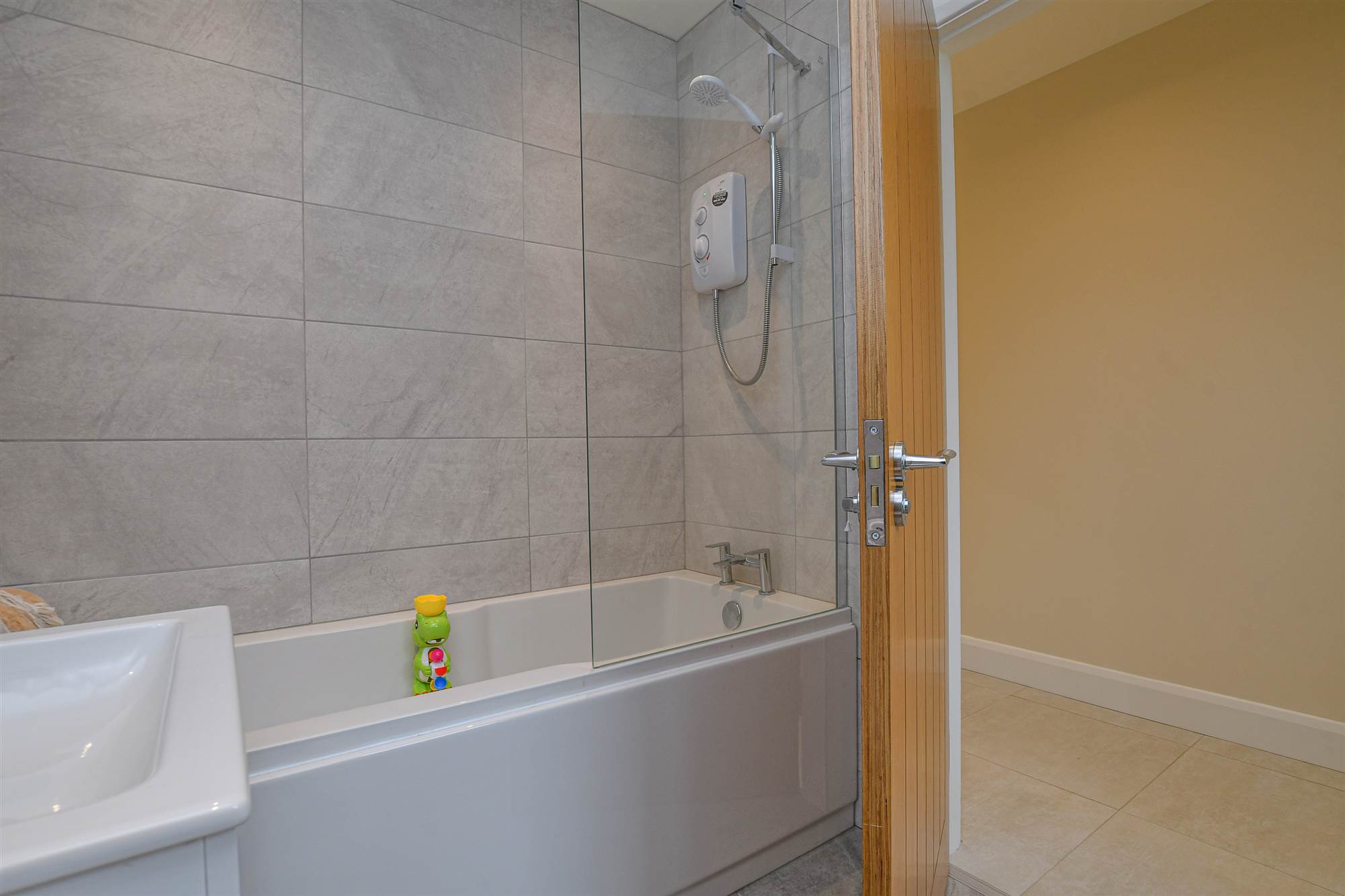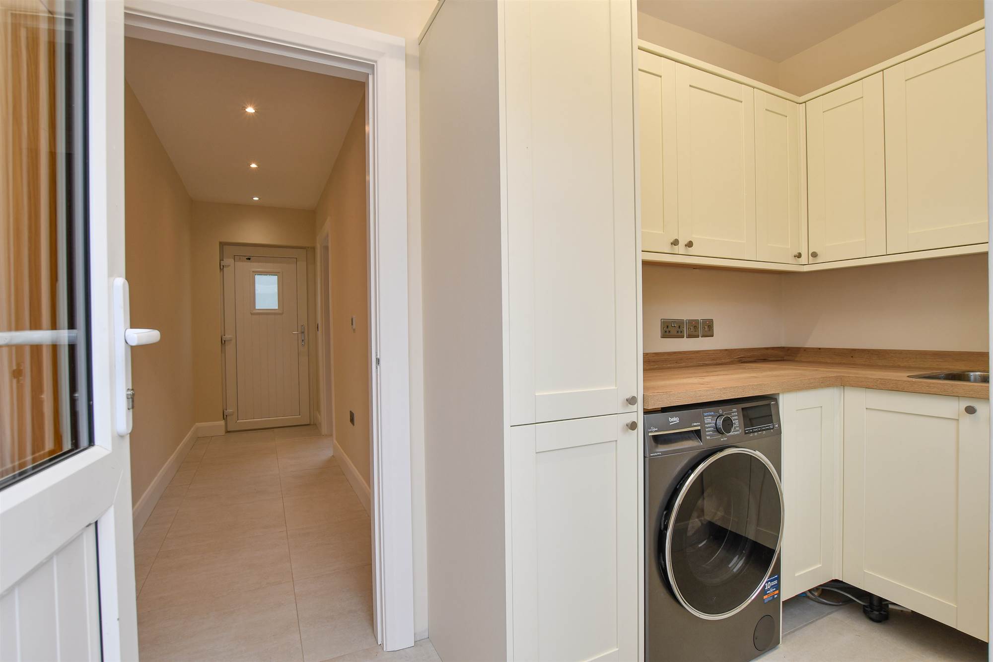 There are three bedrooms to include principal bedroom with ensuite shower room, all well-proportioned and suitable for family use or guests. The main bathroom has been updated with modern fittings, including a bath with shower above, and is finished in a clean, contemporary style. A separate utility room provides additional storage and space for laundry appliances.