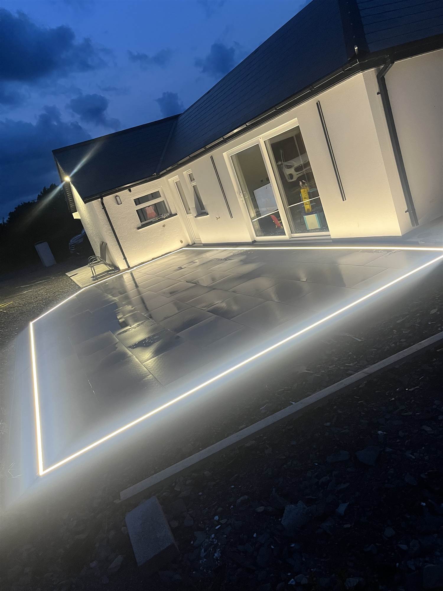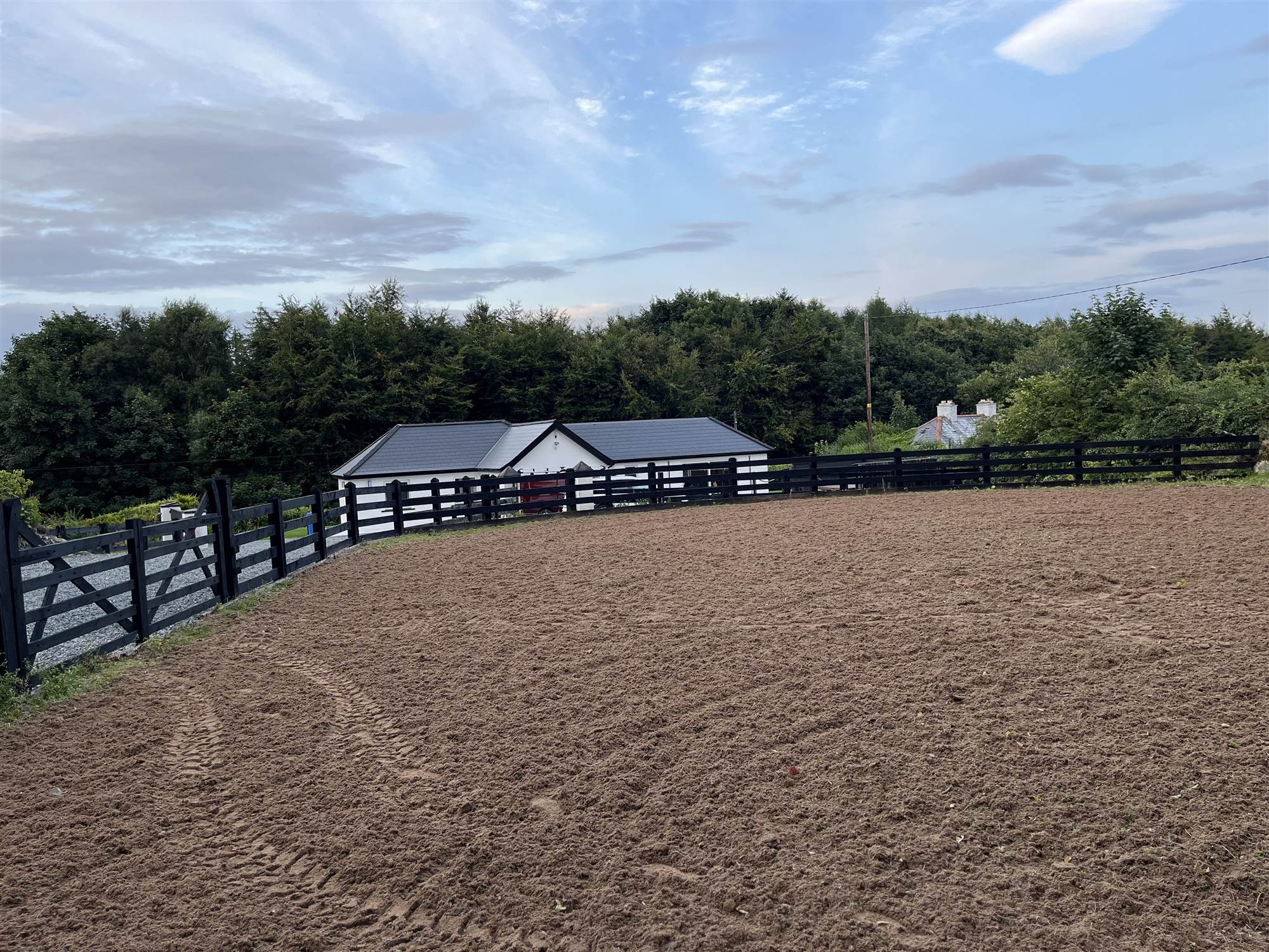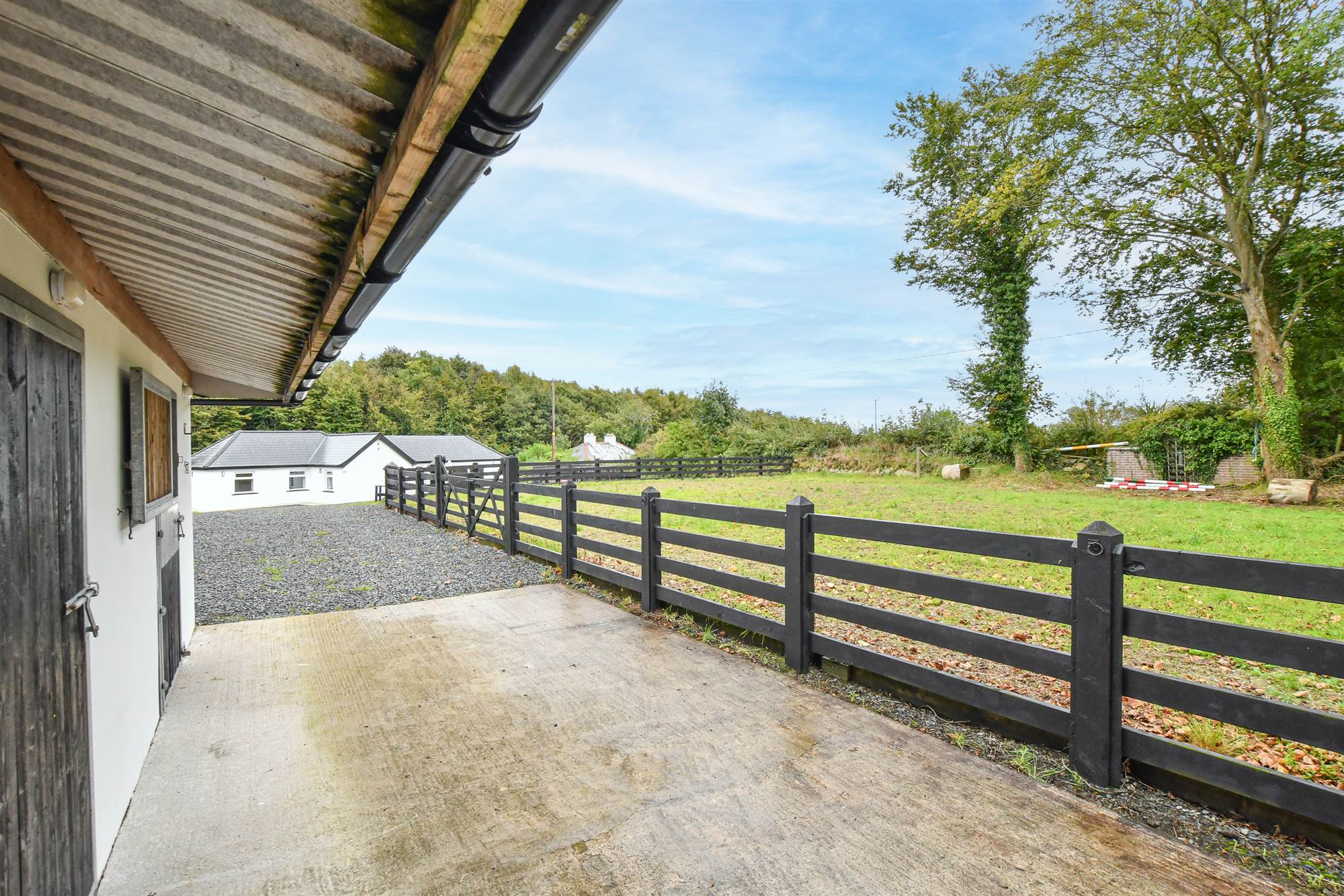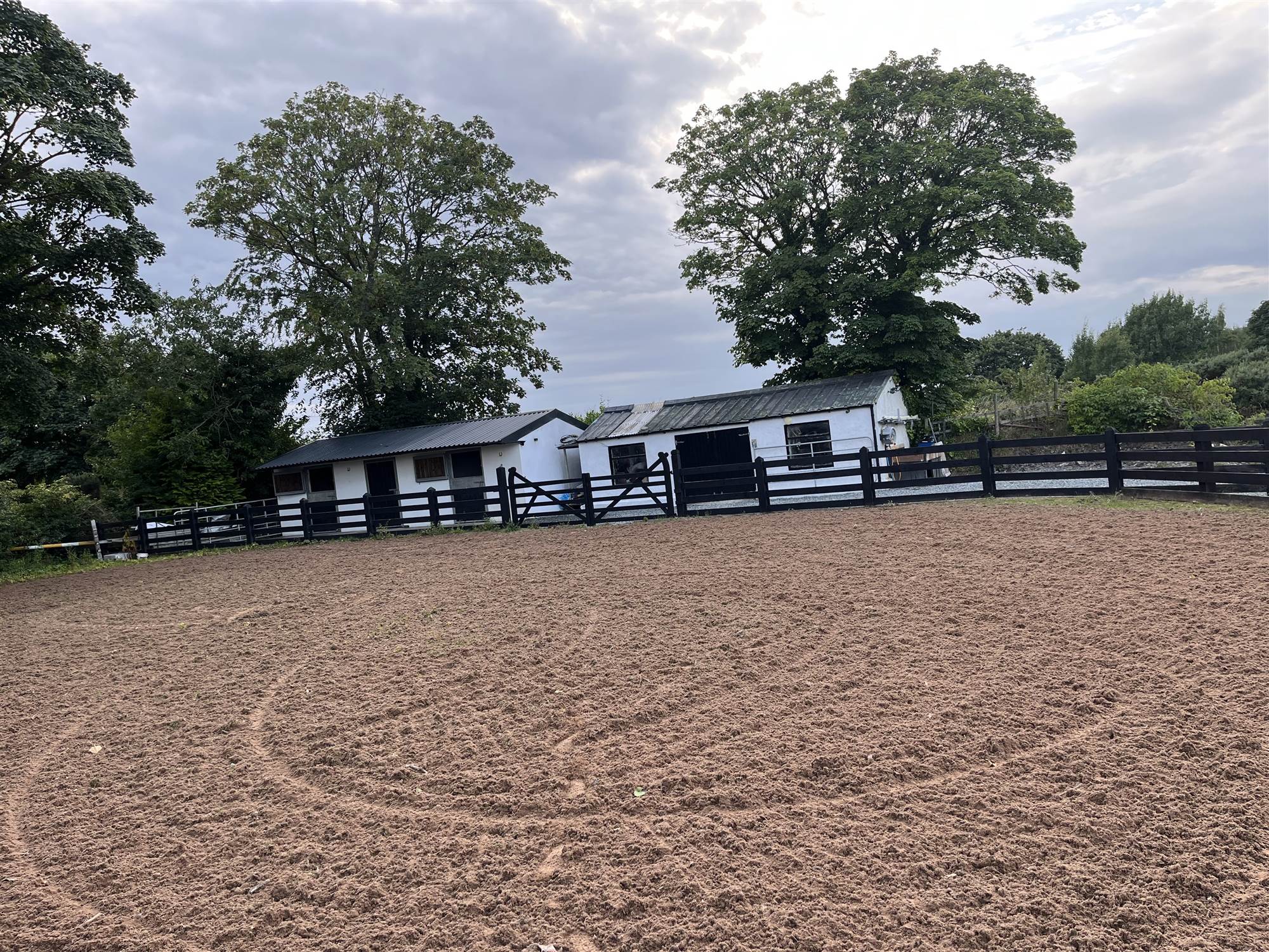 Externally, there is a neat front garden and an exceptional paved patio area with feature lighting to the rear whilst the property sits on a generous plot with several useful outbuildings. There are three stables, making it suitable for horse owners or those interested in keeping animals. In addition to the stables, there is a garage/shed that provides further storage or workshop space and a sandschool.