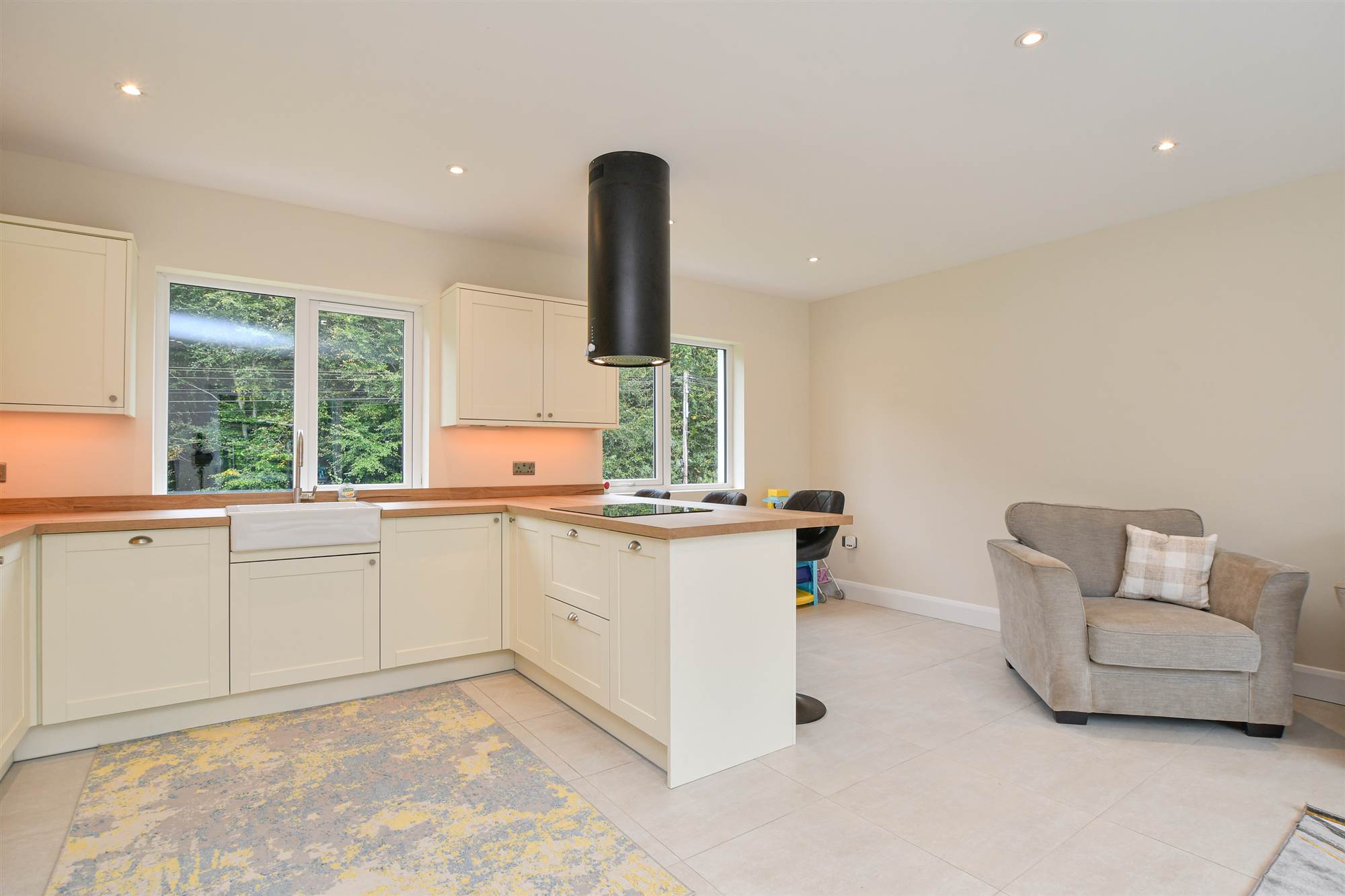 Inside, the home features a modern open-plan layout that combines the living room, kitchen, and dining area. This space is bright and functional, designed for everyday living and entertaining. The kitchen includes contemporary units and integrated appliances, and lovely views of the rear patio area and decking.