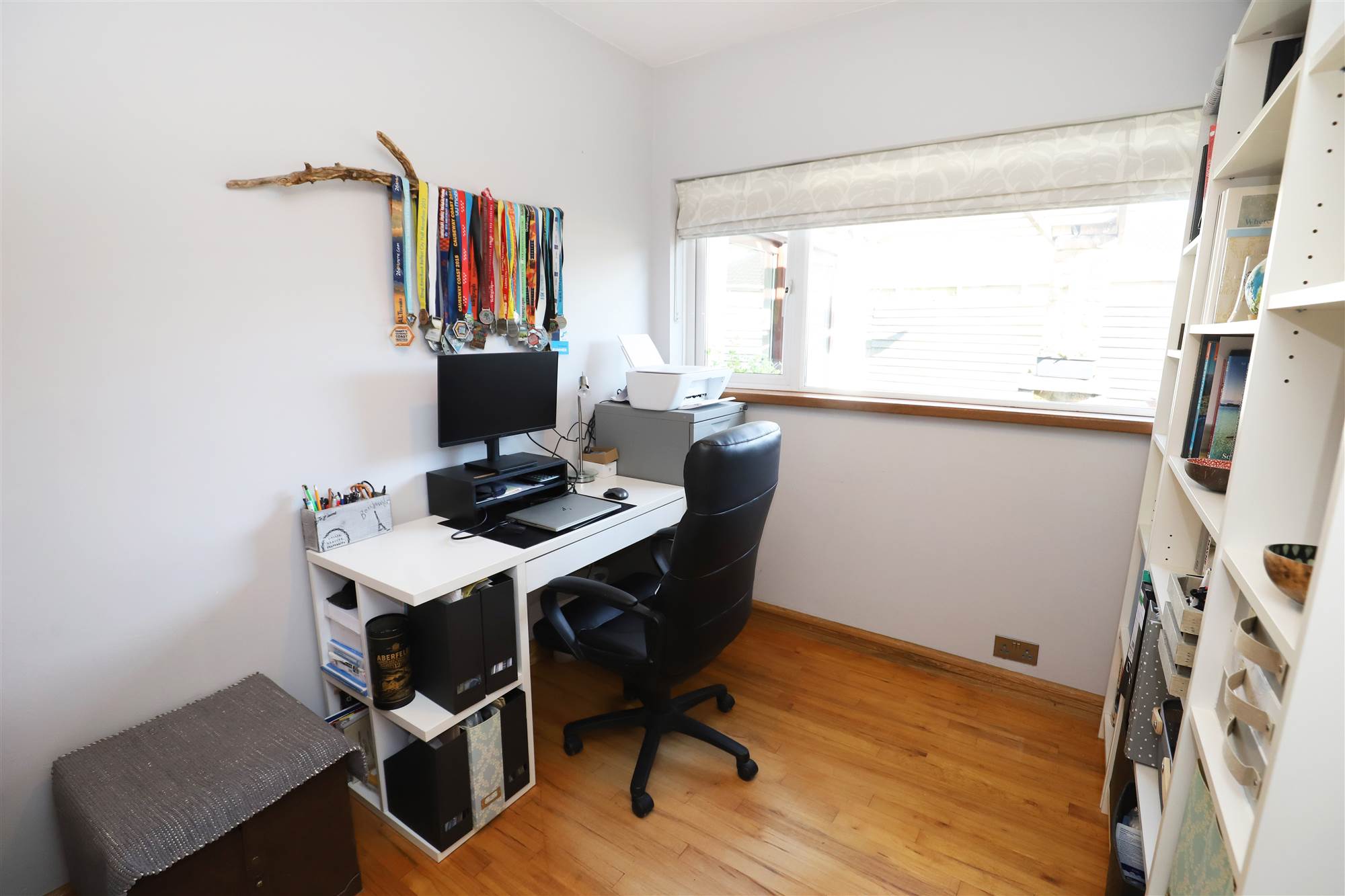 Solid wood floor, double panel radiator. Hot press with pre-insulated copper cylinder and immersion heater.