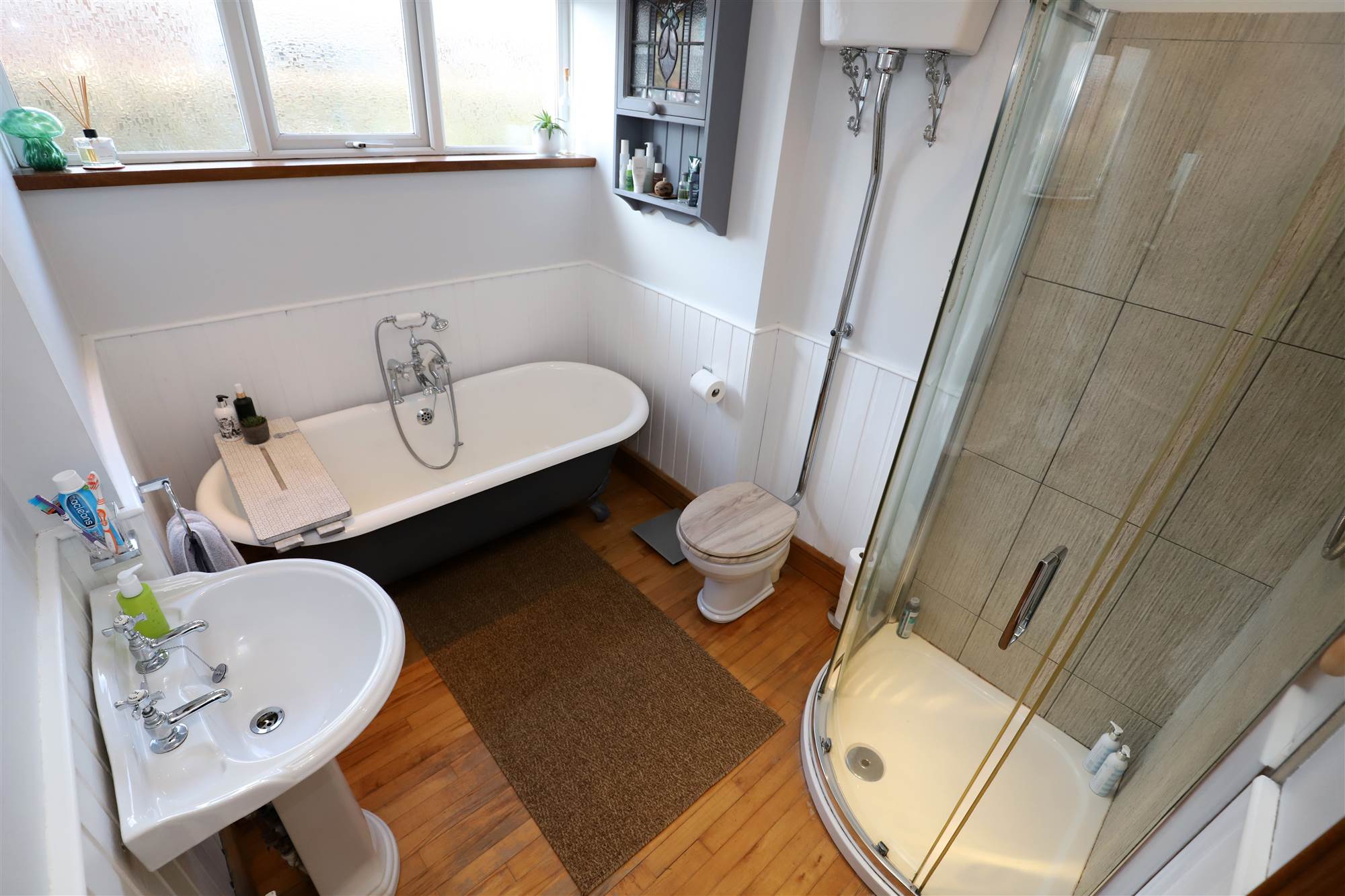 White suite with chrome fittings comprising roll-top bath with telephone hand shower, separate quadrant shower cubicle with tiled walls, electric Mira shower and fan-light over, pedestal wash hand basin, high flush wc. Solid wood floor, part tongue and groove walls and ceiling, chrome accessories, recessed lighting, extractor fan, double panel radiator.