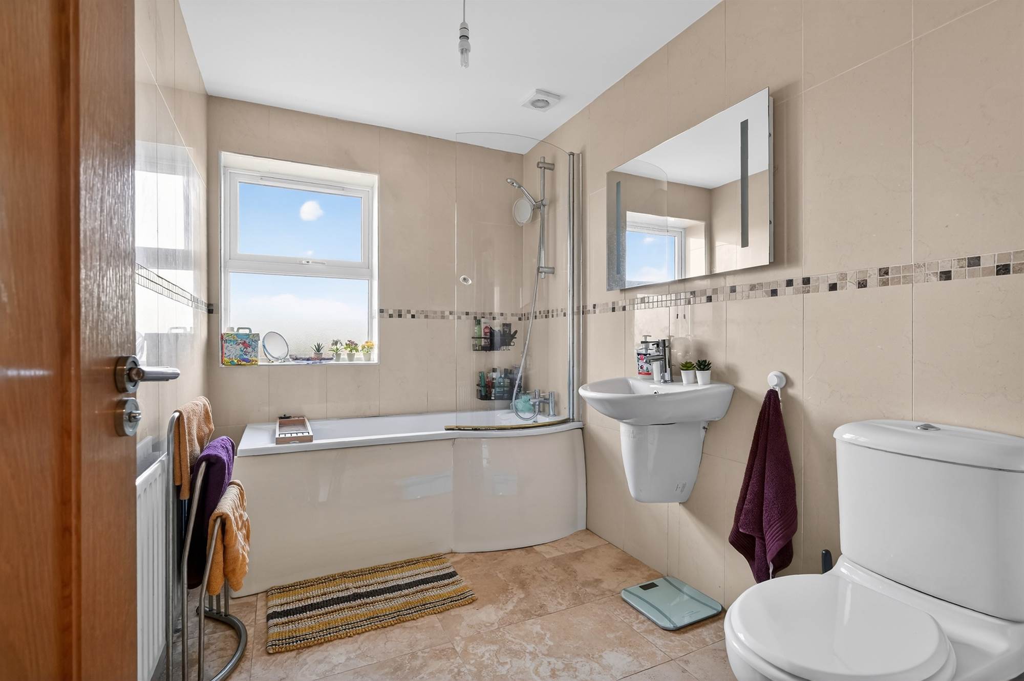 Luxury fully tiled white suite comprising low flush WC, wash hand basin, corner shower tray, recessed spotlights, extractor fan, velux window.