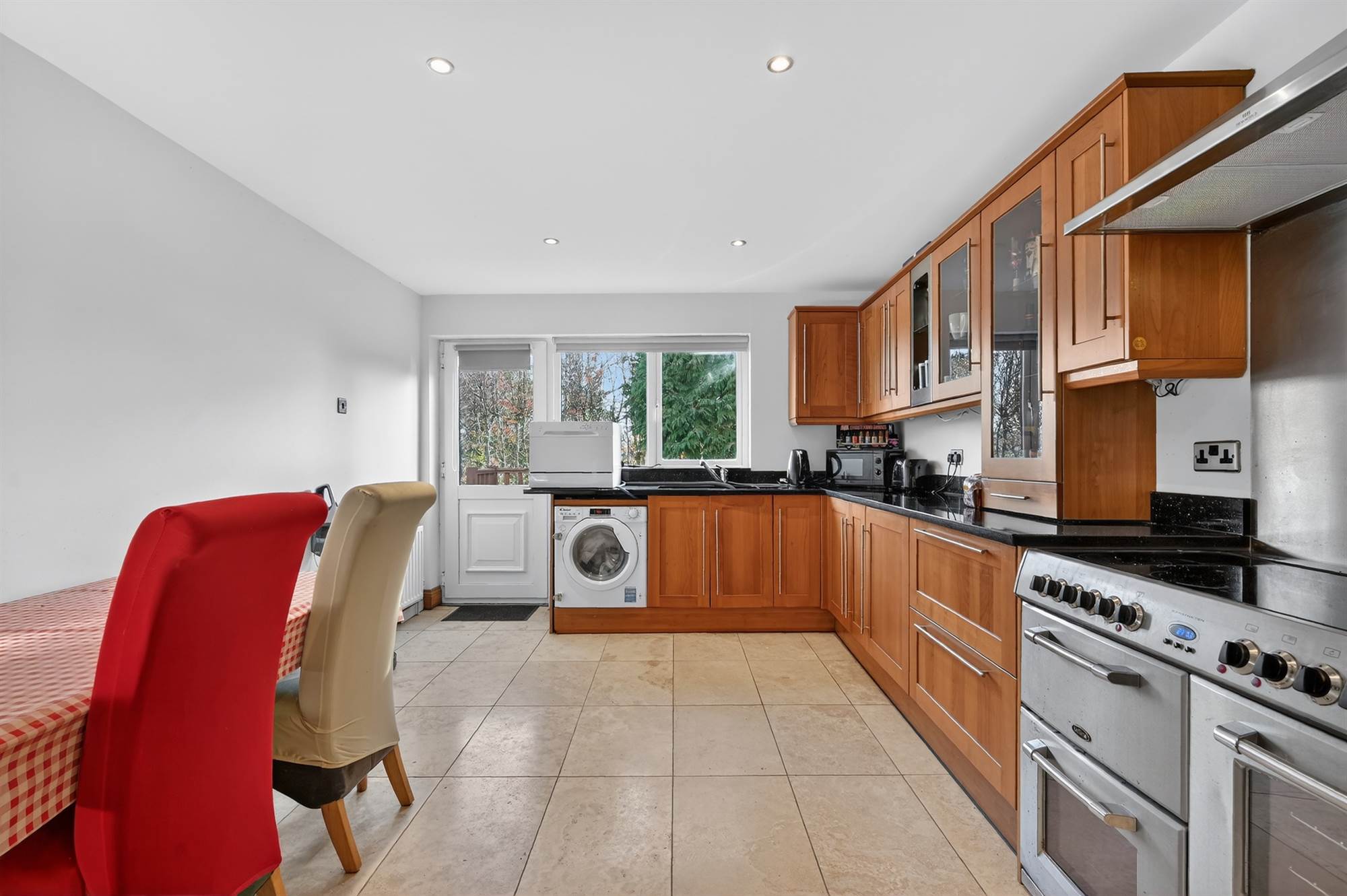 Modern fitted kitchen with extensive range of high and low level units, granite work surfaces, sink unit, extractor hood, recessed spot lighting, travertine tiled floor, door to rear.
