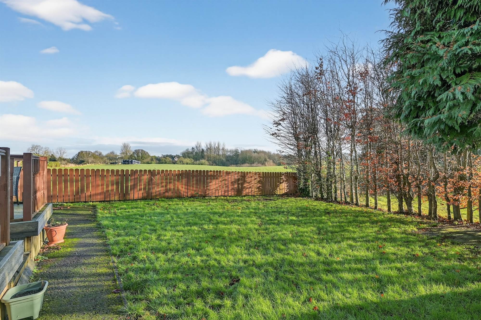 Extensive rear decking with handrails and balustrades. Level lawn with border fencing and hedging.
