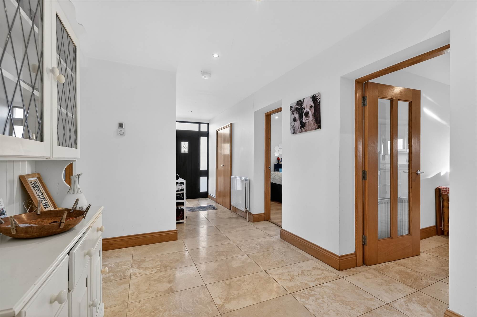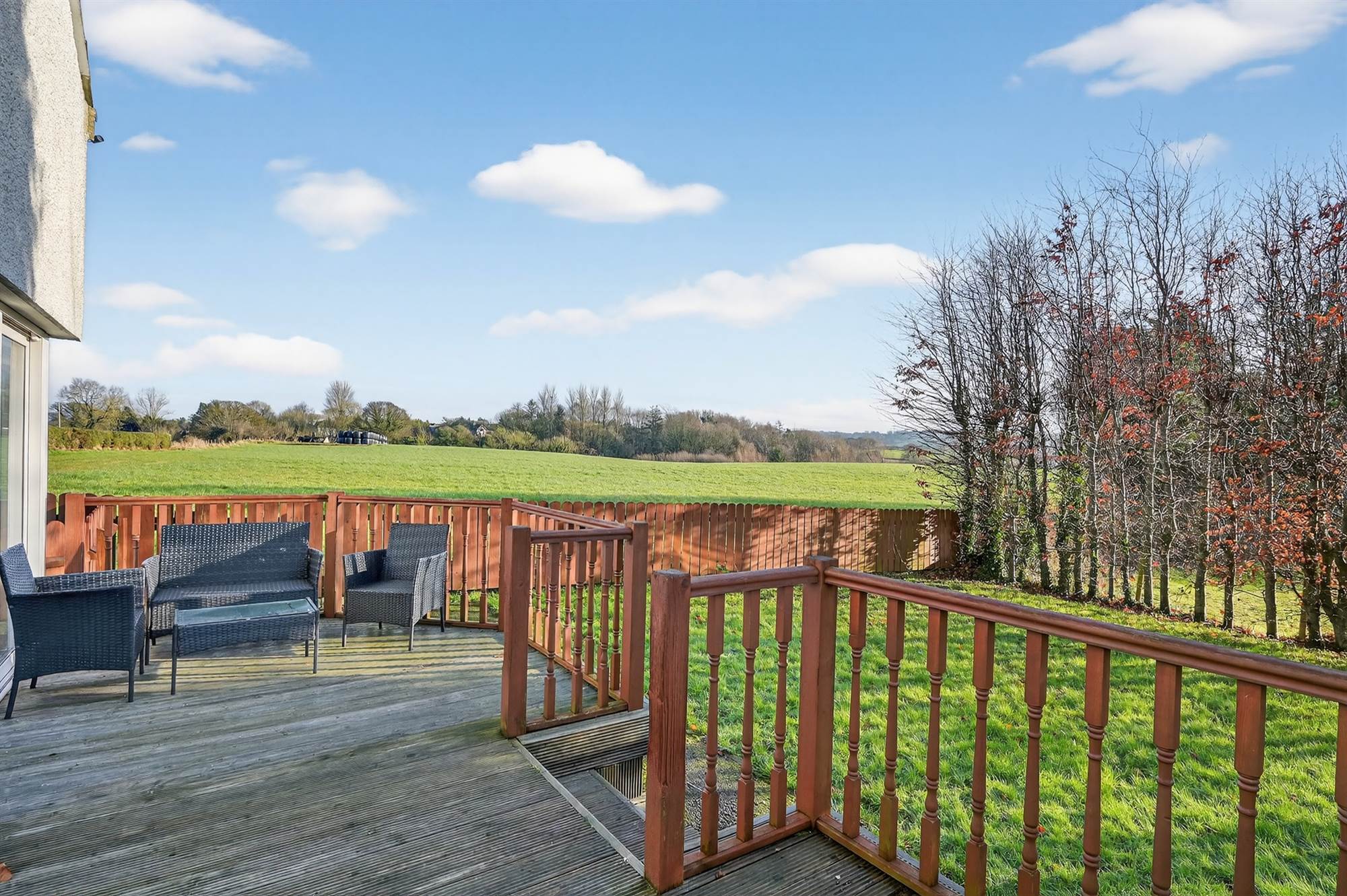 The property benefits from a double storey extension and offers flexible accommodation currently comprising three bedrooms and two separate reception rooms (or four bedrooms, one reception), spacious kitchen with integrated appliances and dining area, ground floor bathroom and en suite shower room on the first. Externally there is generous driveway parking, an extensive rear deck overlooking the lawn and surrounding fields.