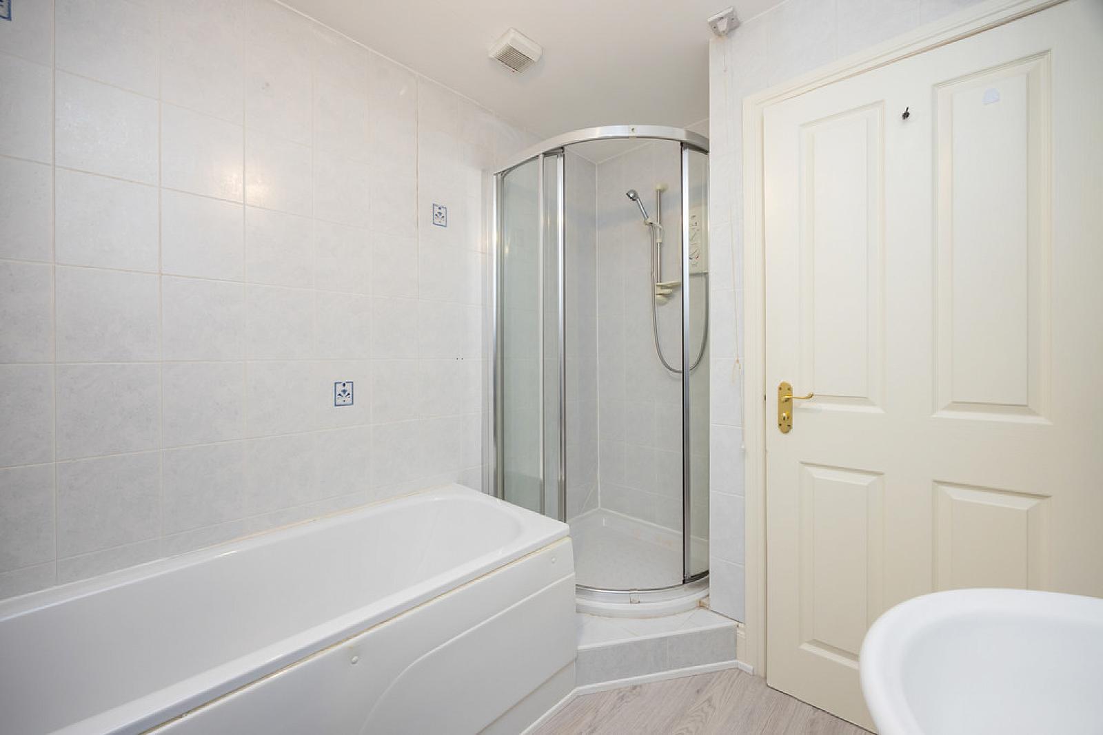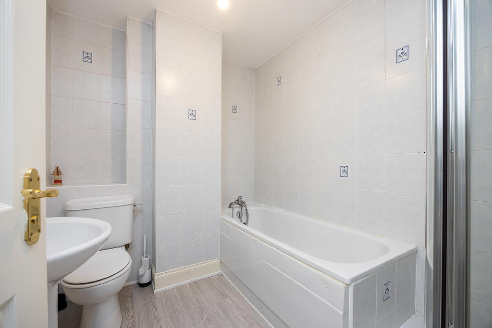 BATHROOM White suite comprising low flush WC, pedestal wash hand basin, panelled bath, fully tiled shower cubicle, fully tiled walls, laminate wood effect floor.