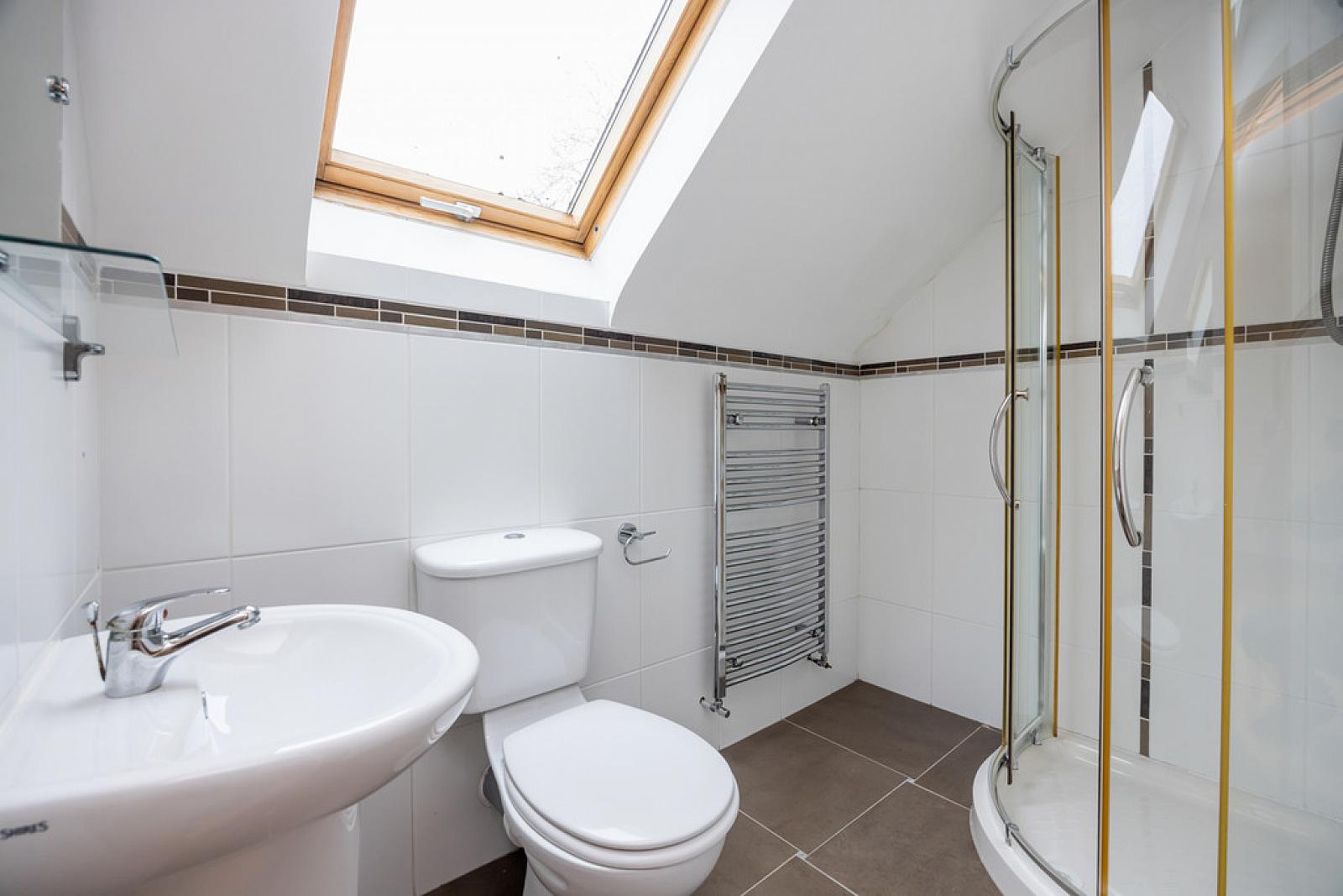 ENSUITE SHOWER ROOM White suite comprising low flush WC, half pedestal wash hand basin, fully tiled shower cubicle, fully tiled walls, tiled floor, chrome heated towel rail, Velux window.