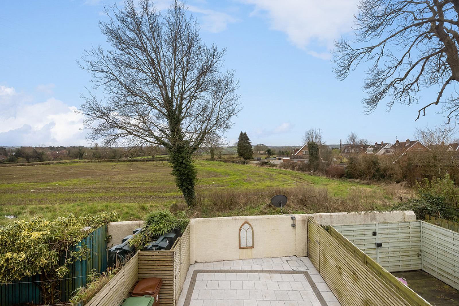 OUTSIDE Residents and visitor car parking, enclosed and private paved rear garden with boundary fence and wall, overlooking open fields, oil tank, oil fired boiler.