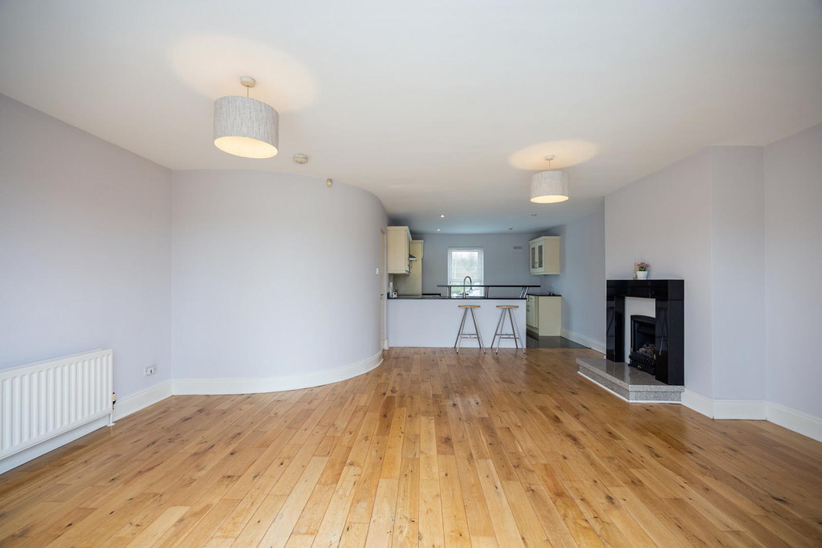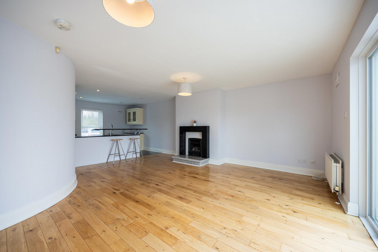 LOUNGE WITH DINING AREA 27' 11" x 18' 8" (8.51m x 5.69m) (overall to include the Kitchen) Wood flooring, attractive granite fireplace with raise granite hearth and gas coal effect fire, feature curved wall, uPVC double glazed doors to rear garden area.