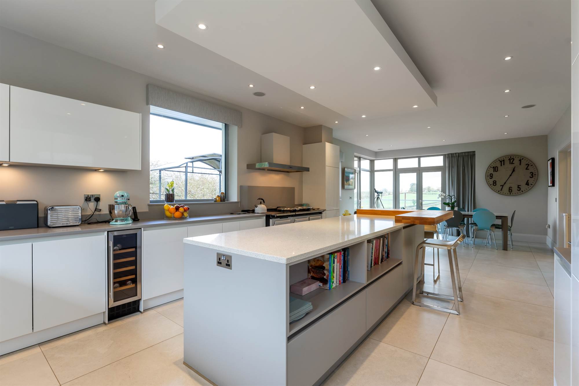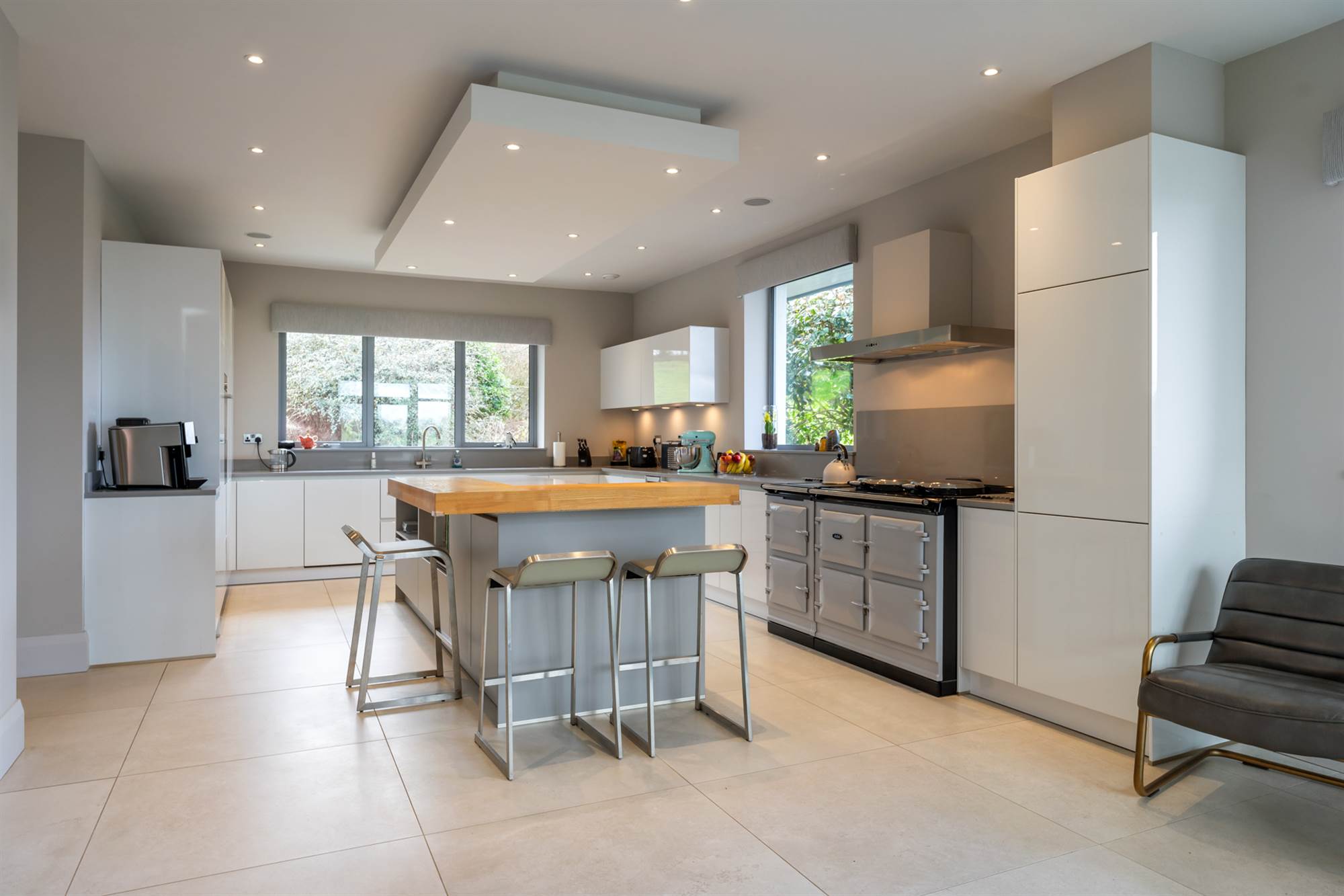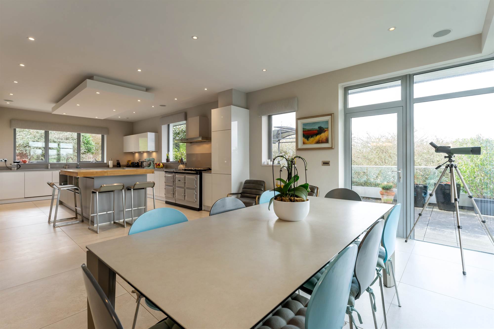 Contemporary modern kitchen by Interior 360, excellent range of high- and low-level units. Reconstituted stone work tops with stainless steel sink unit with mixer taps, built in Semen's high level oven and combi microwave oven, warming drawer, full length fridge and freezer, twin dishwasher, 'Blanco' inset stainless steel sink unit, wine fridge, 4 oven electric (eR7) aga and extractor fan. Large breakfast item with reconstituted stone worktops, raised Oak built-in breakfast bar, built in shelving, porcelain tiled floor, triple aspect windows, mature outlook, open to ample dining area with low voltage spotlight. Access to Balcony.