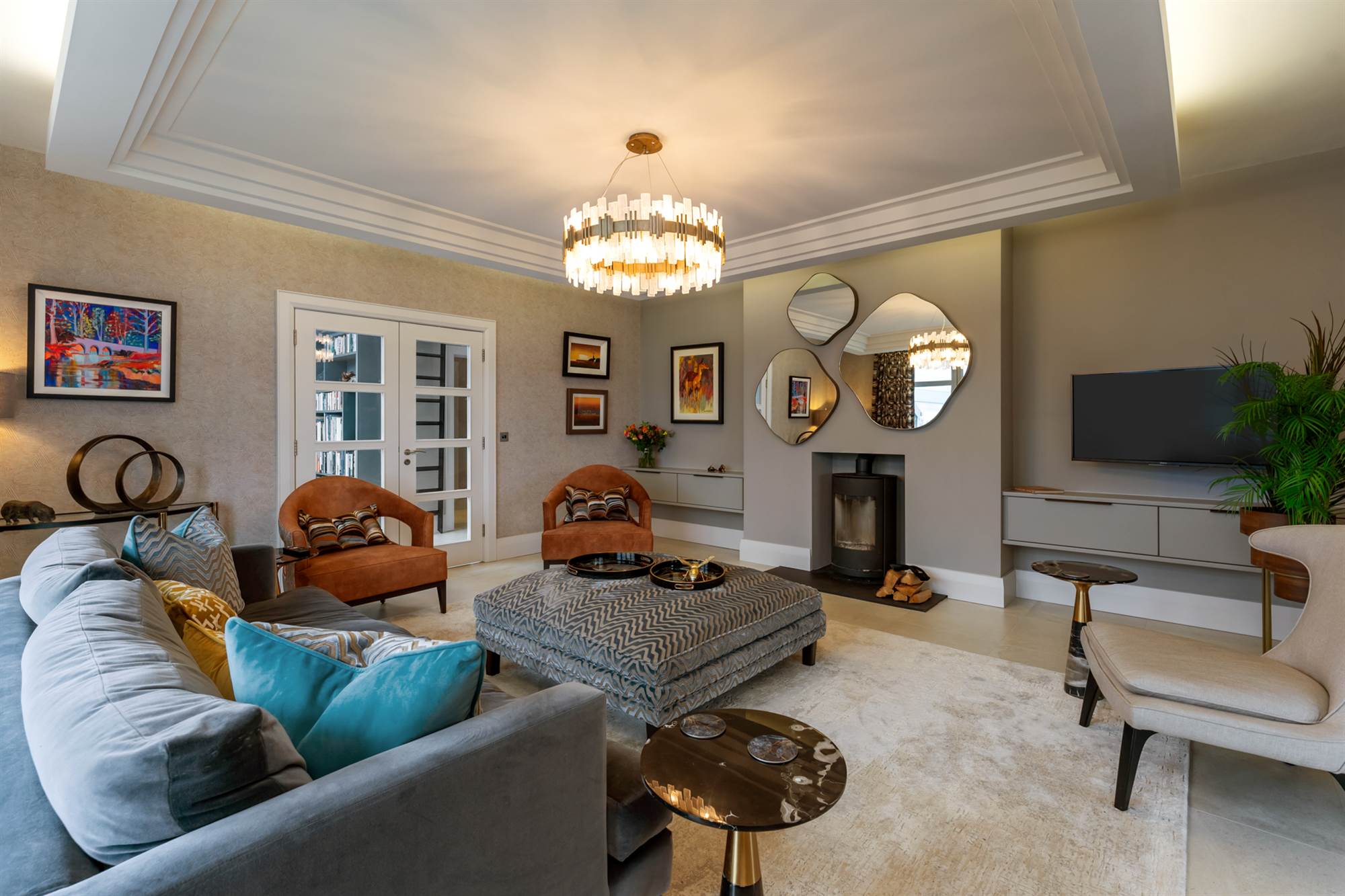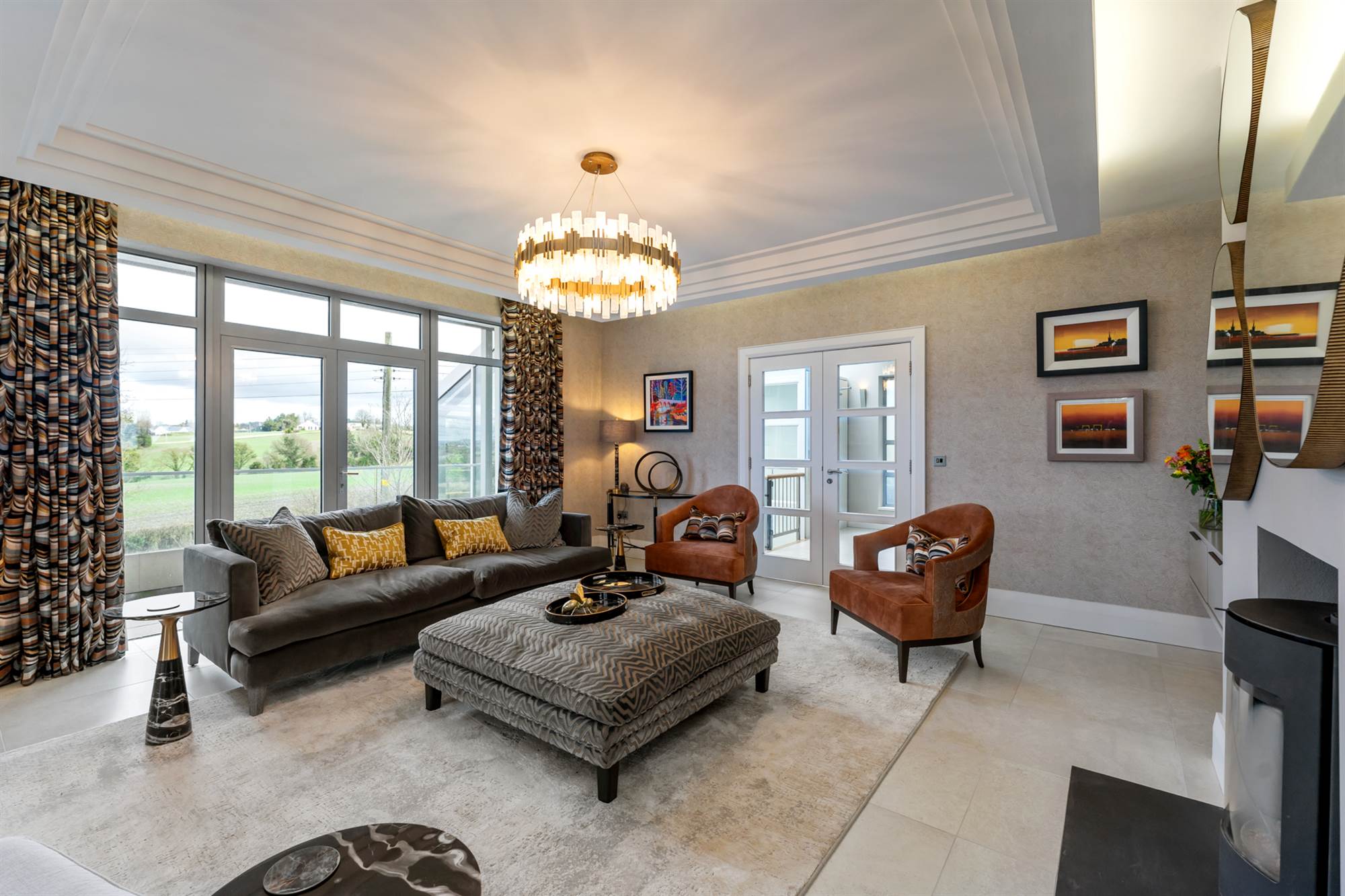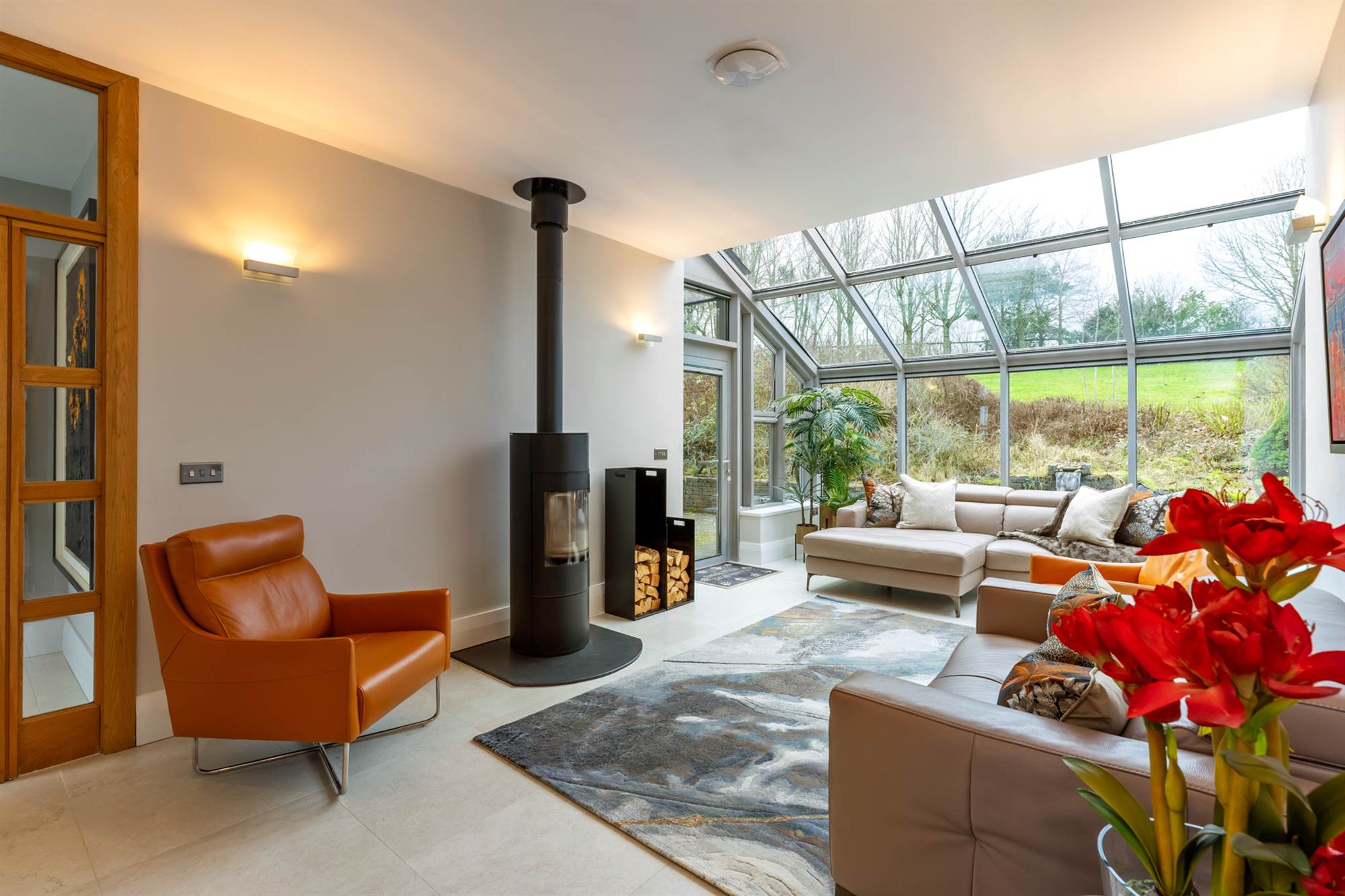 Beautiful views across rolling countryside, aluminium French doors to balcony views to Antrim Hills, porcelain tiled floor, contemporary cast iron woodburning stove with tiled hearth, modern recess lighting.