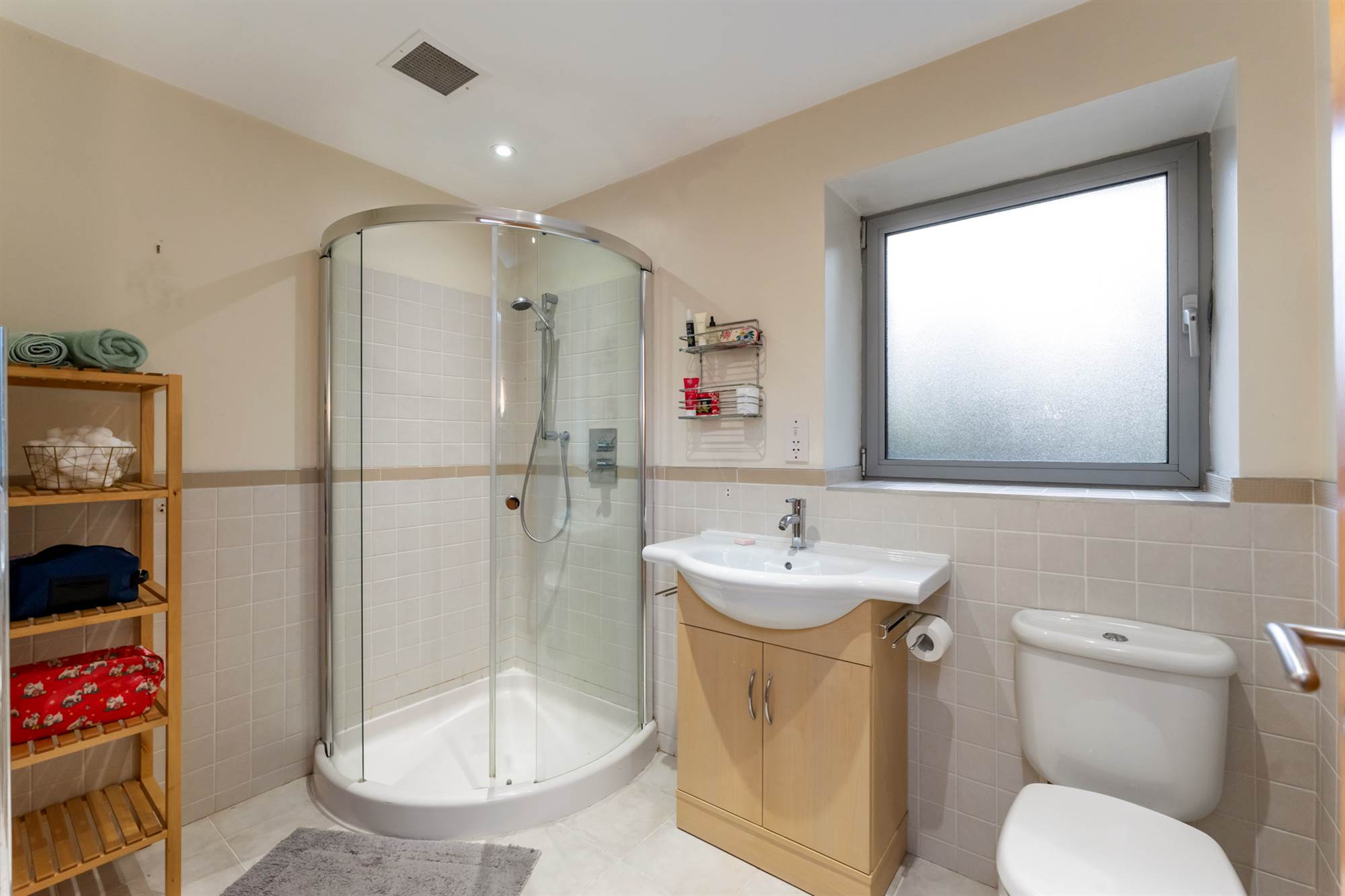 Corner shower cubicle with glass doors, vanitory unit, low flush wc, heated towel rail, part tiled walls, ceramic tiled floor.