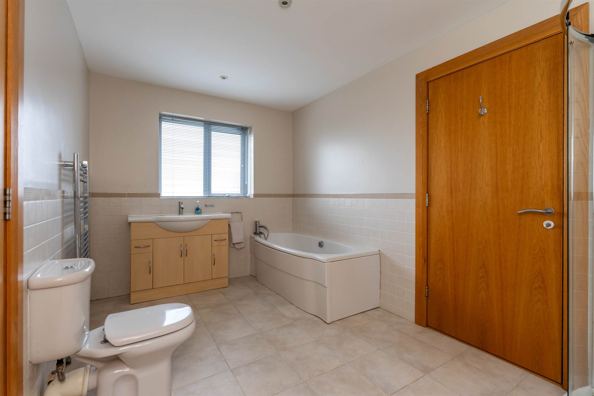 Panelled bath, corner shower cubicle with sliding glass door, low flush wc, vanitory unit, heated towel rail, part tiled wall, ceramic tiled floor.