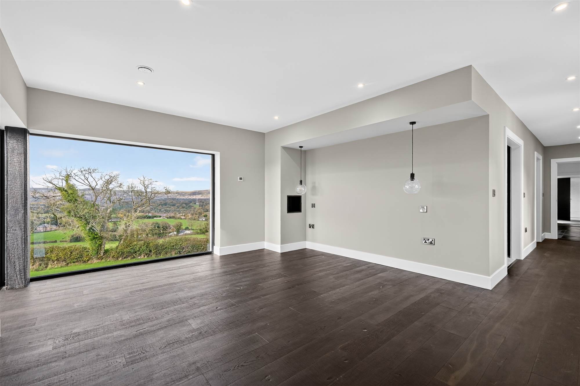 Modern fully fitted kitchen with excellent range of high and low level units, built-in display unit, large built-in wine cooler, integrated fridge, pull-out larder cupboard with feature lighting and walnut shelving, five ring induction hob with suction extractor fan, built-in high level Neff oven and combi microwave, breakfast island unit with Decaton worktop, sink unit with Quooker tap, integrated dishwasher and freezer, built-in breakfast bar, excellent views across Lagan Valley to Antrim Hills, aluminium double glazed sliding door to patio garden, cast iron wood burning stove, additional built-in oven, porcelain tiled floor, picture windows across courtyard, aluminium double glazed sliding door to courtyard. Glazed access door to . . . .