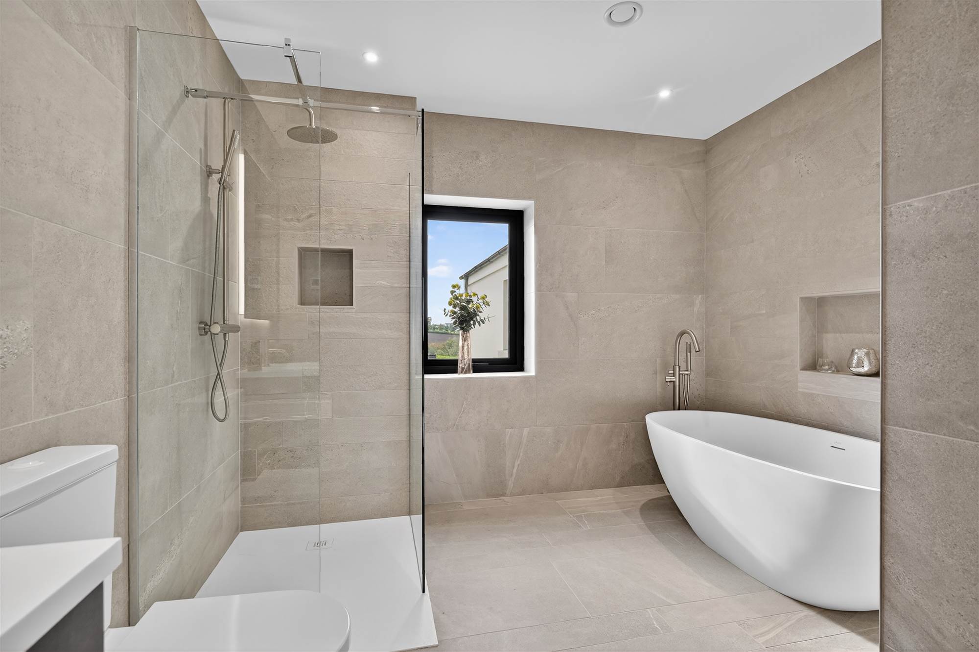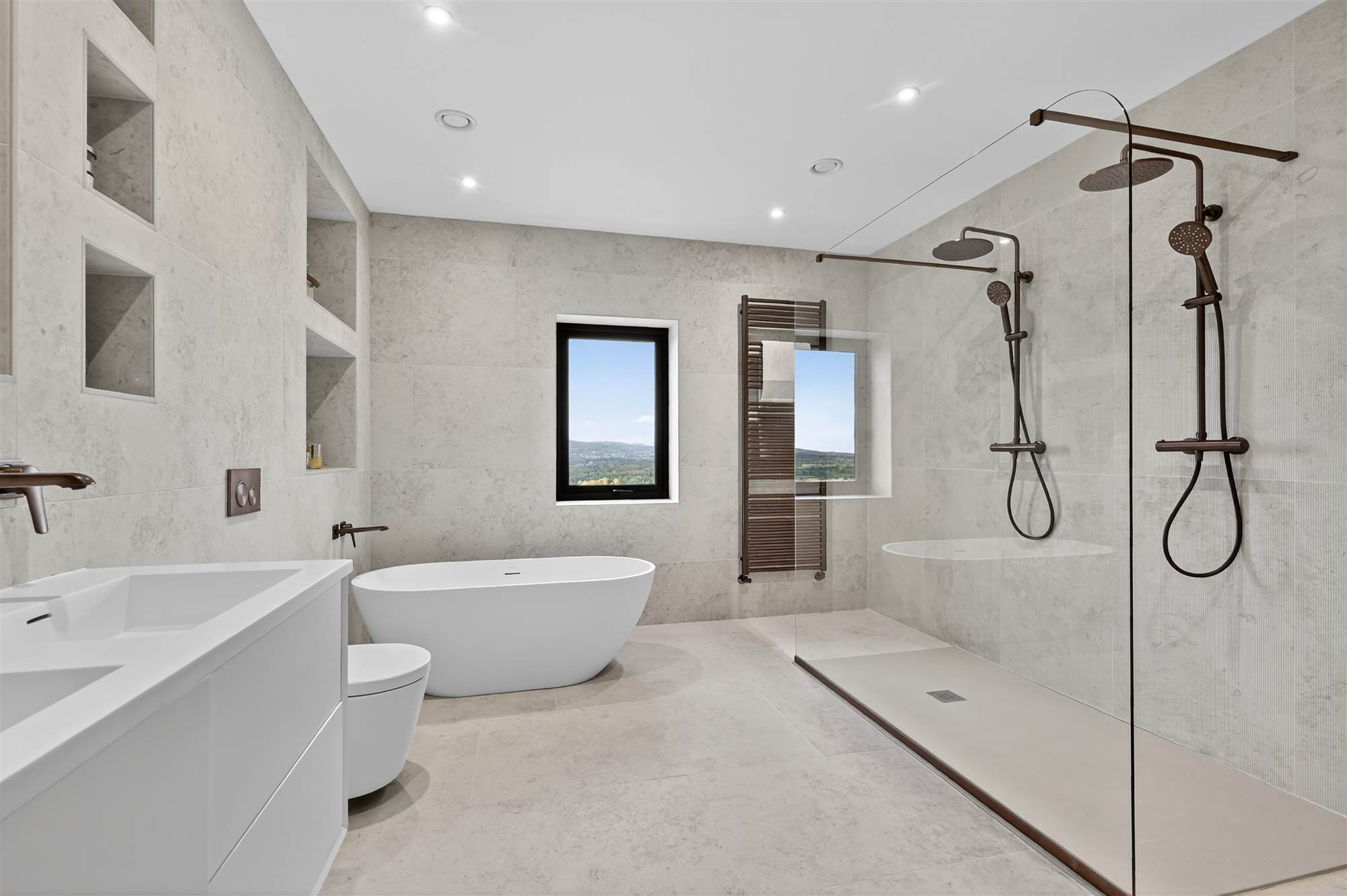 White suite comprising Jack and Jill vanity unit with built-in cabinet below, Lusso bath with mixer tap, close coupled wc, walk-in double shower unit with double overhead brass shower unit, two brass heated towel rails, fully tiled walls, porcelain tiled floor, built-in display units, low voltage spotlights, hatch to roofspace, views across rolling countryside.