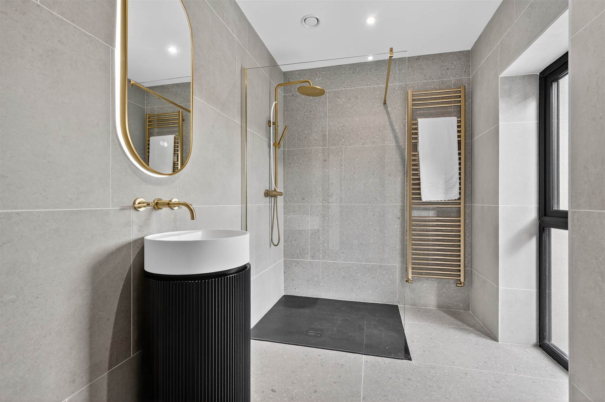 White suite comprising close coupled wc, vanity unit with gold mixer tap, walk-in shower with slate tray, drying area and gold overhead shower unit, gold heated towel rail, fully tiled walls, porcelain tiled floor.