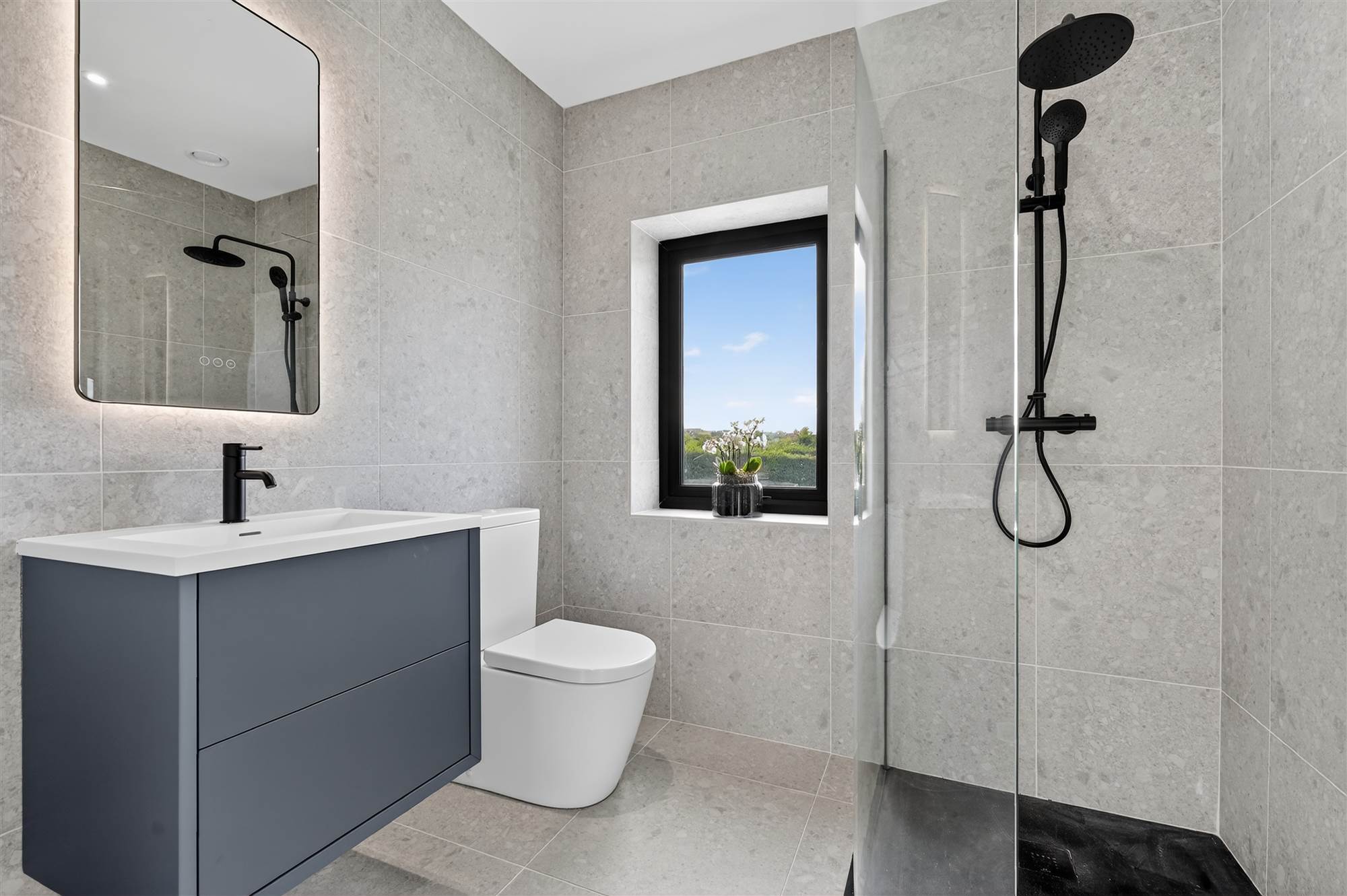 White suite comprising walk-in double shower unit with overhead shower, low flush wc, vanity unit with mixer tap and Decaton worktop, porcelain tiled floor, fully tiled walls, heated towel rail.