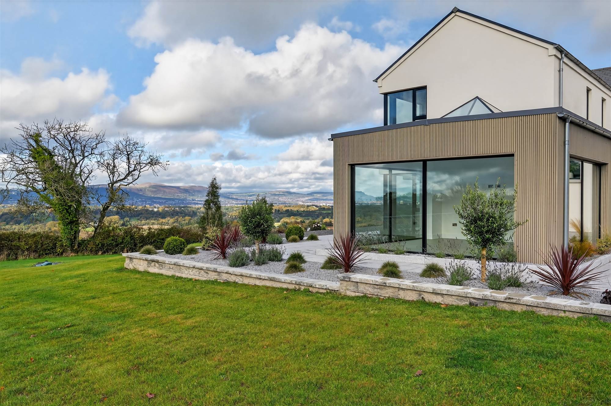 Access via electric gates to tarmac driveway with brick paved patio area leading to double garage. Sitting on approximately 1.5 acres of landscaped gardens laid in extensive lawns with flower beds and shrubs, mature planting with excellent views across rolling countryside to Belfast and the Antrim Hills. Large courtyard with granite paving and built-in panelled centre piece with Japanese Acer, hot and cold water taps, outdoor electric socket for electric vehicle charger, feature lighting. Stone access to . . .