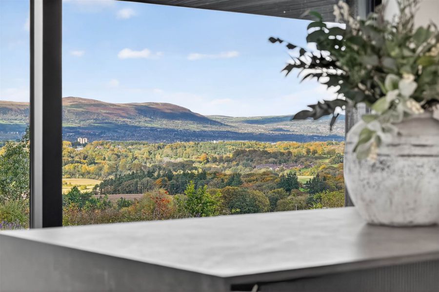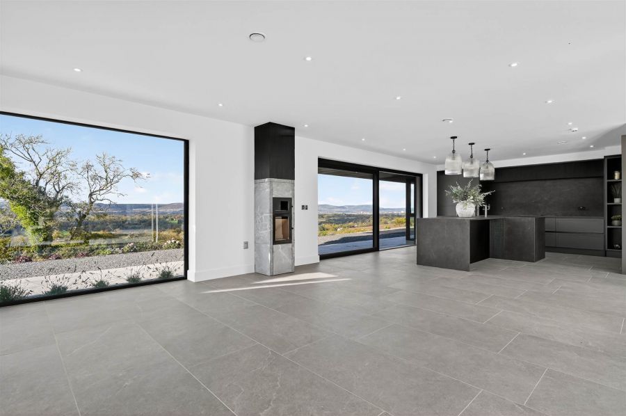Porcelain tiled floor, built-in shelving with Decaton worktops, low voltage spotlights. Access through glass corridor with views to rolling countryside to Antrim Hills to . . .