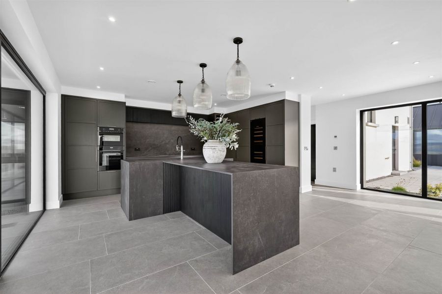 Modern fully fitted kitchen with excellent range of high and low level units, built-in display unit, large built-in wine cooler, integrated fridge, pull-out larder cupboard with feature lighting and walnut shelving, five ring induction hob with suction extractor fan, built-in high level Neff oven and combi microwave, breakfast island unit with Decaton worktop, sink unit with Quooker tap, integrated dishwasher and freezer, built-in breakfast bar, excellent views across Lagan Valley to Antrim Hills, aluminium double glazed sliding door to patio garden, cast iron wood burning stove, additional built-in oven, porcelain tiled floor, picture windows across courtyard, aluminium double glazed sliding door to courtyard. Glazed access door to . . . .
