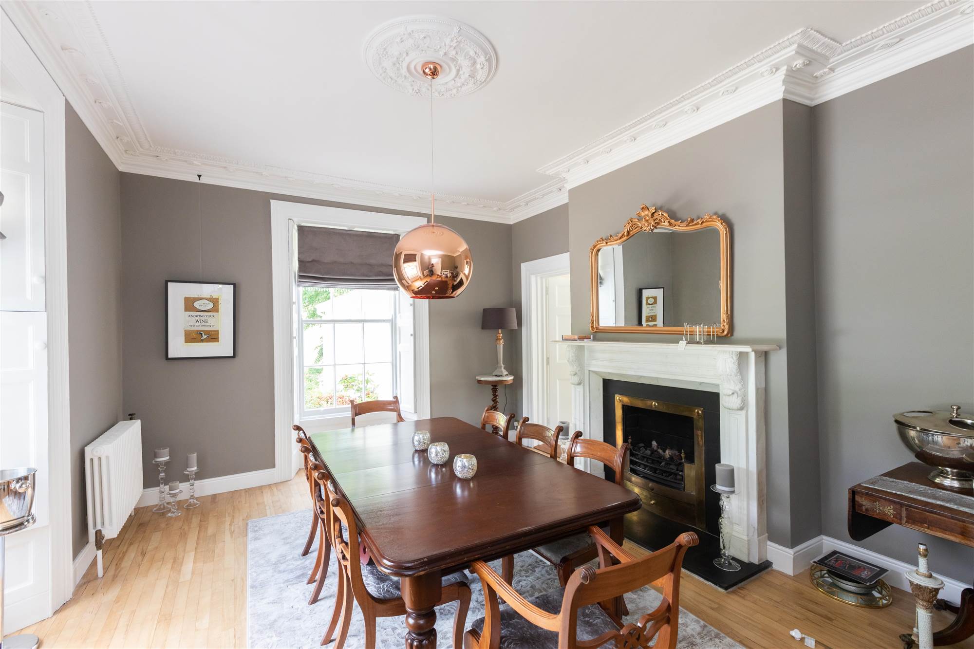 Corniced ceiling. Ceiling rose. Magnificent period fireplace in Sienna marble with brass inset and slate hearth. Wood strip floor. Attractive outlook over gardens. Original window shutters. Connecting door to inner hallway.