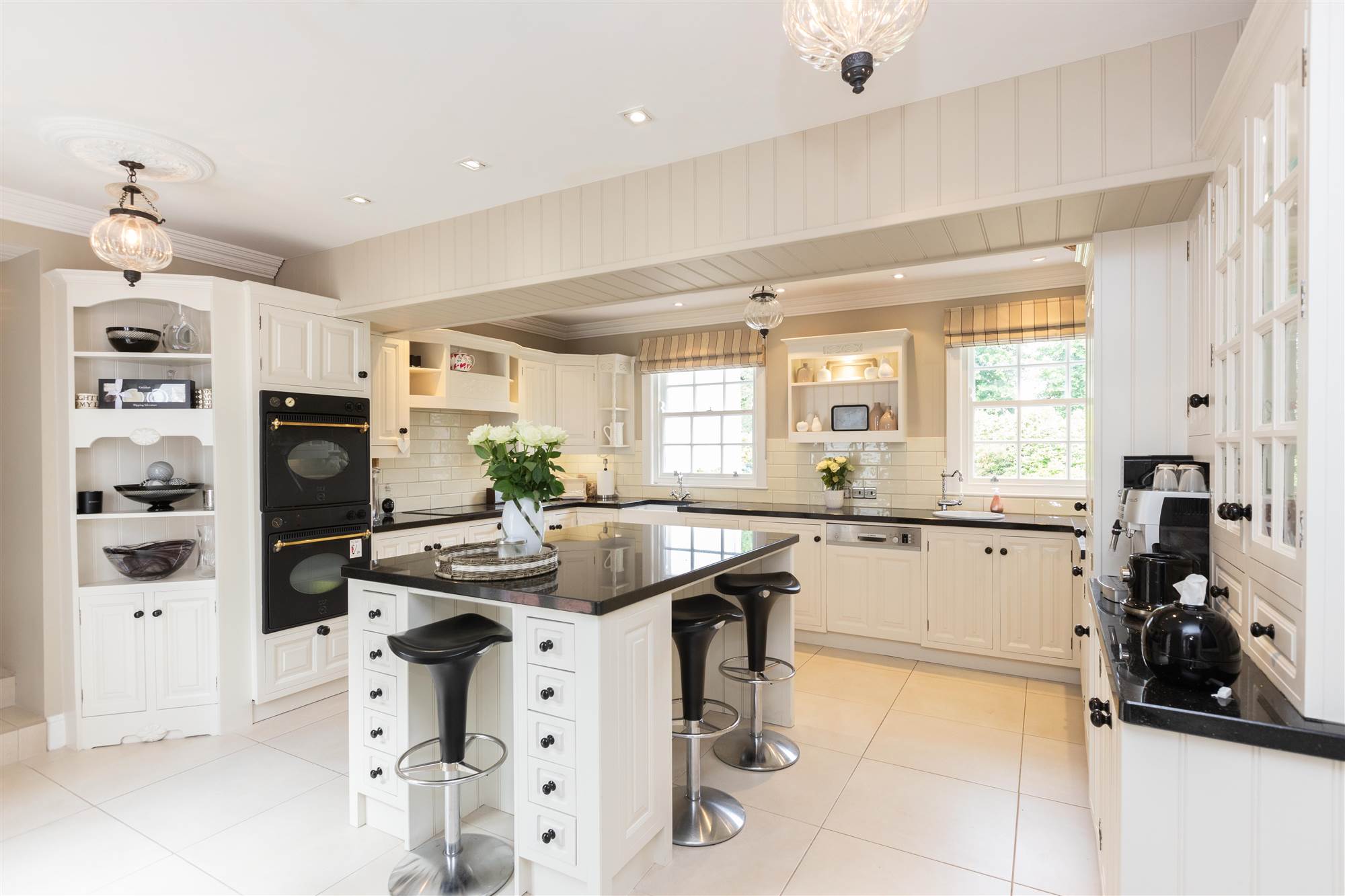Corniced ceiling with ceiling rose. Hand crafted painted kitchen comprising a range of high and low level units with glazed display cabinets. Open shelving. Polished granite work surfaces. Central island unit with breakfast area. Inset Belfast sink with period style chrome mixer taps. Range of appliances including larder fridge, double oven, four ring ceramic hob, and dishwasher. Decorative circular ceramic preparation sink with period style mixer taps. Ceramic tiled floor. Partially tiled walls. Double doors to inner courtyard.