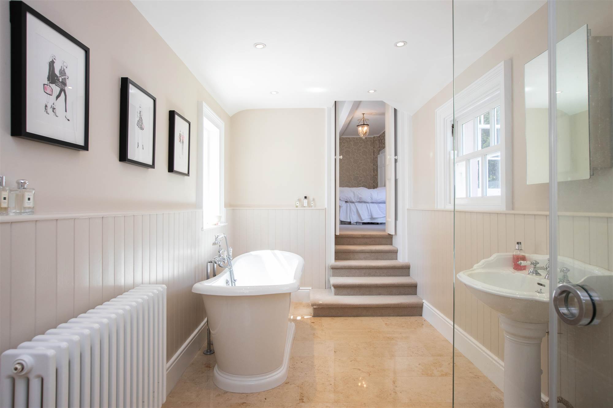 Traditional style white suite comprising; fully glazed corner shower. Freestanding roll top bath. Pedestal wash hand basin. Low flush WC. Half panelled walls. Period style chrome fittings. Marble tiled floor.
