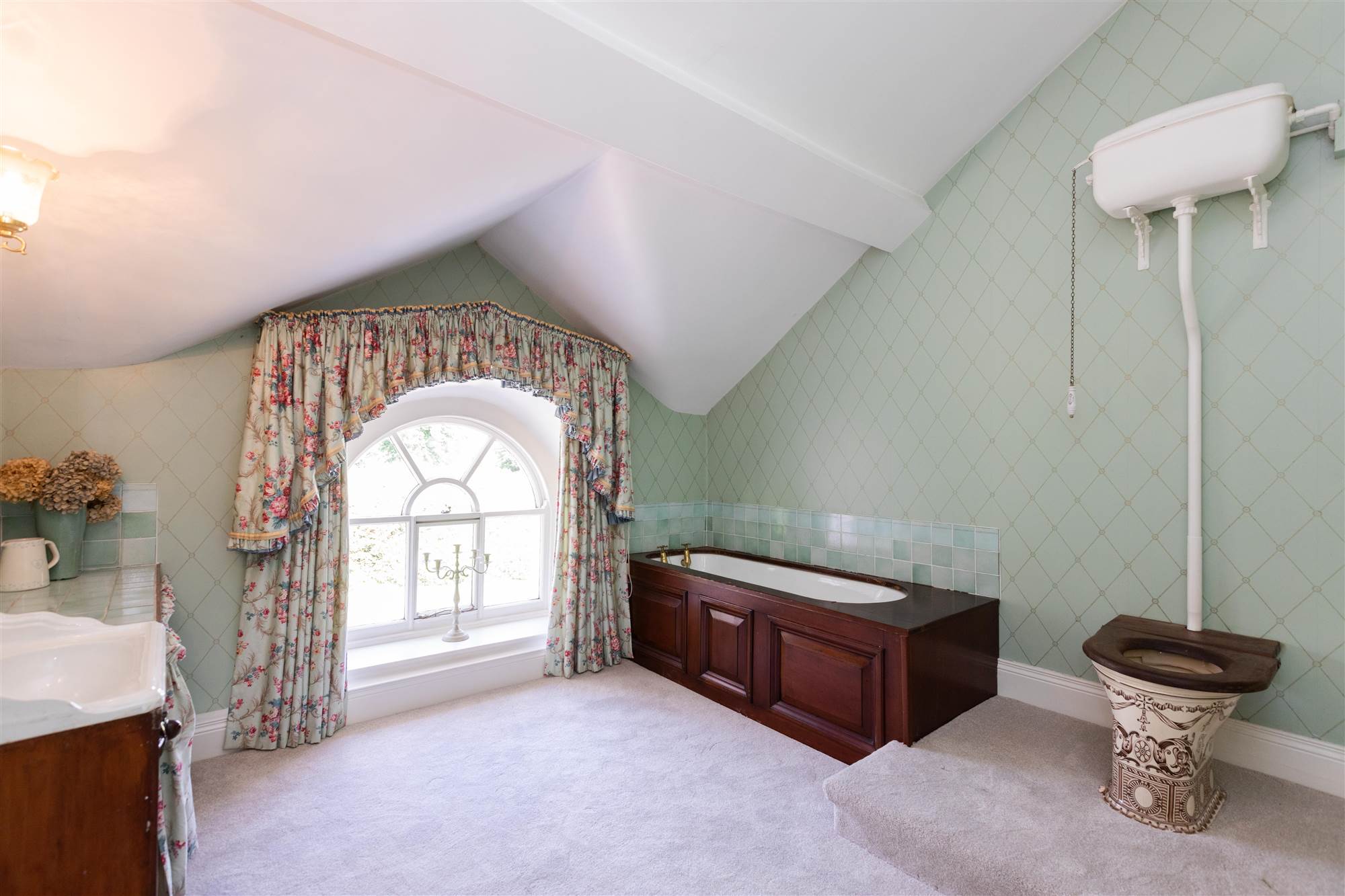 Traditional style suite comprising of decorative wash hand basin and high flush WC, with period style chrome fittings. Corniced ceiling and ceiling rose. Ceramic tiled floor.