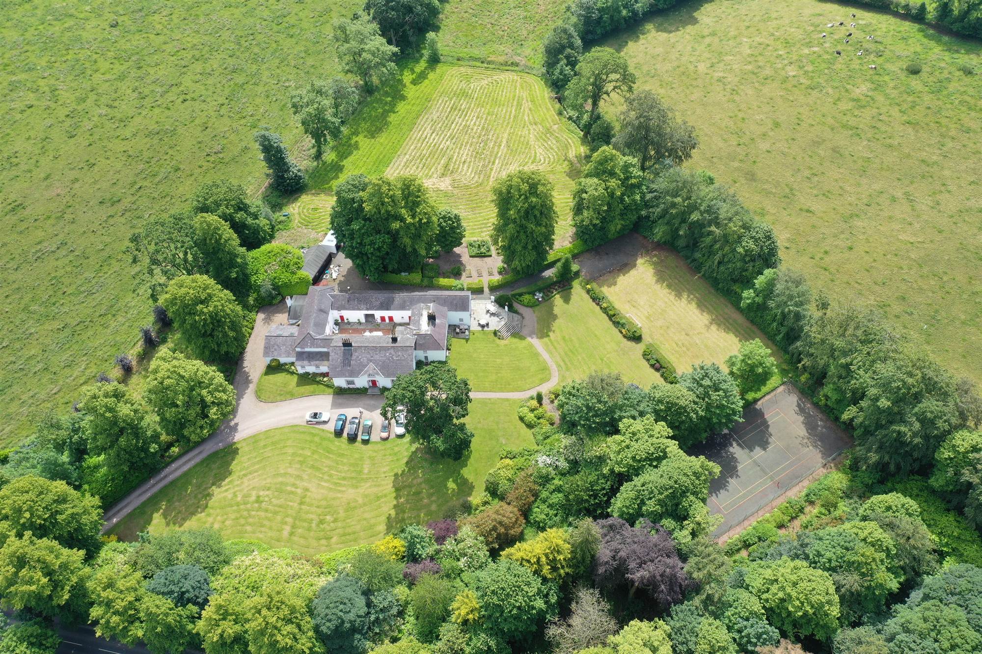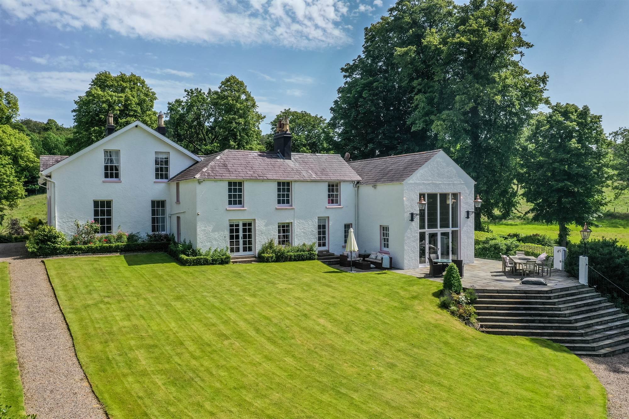 Approached by double entrance gates and a sweeping stoned driveway the magnificent grounds are meticulously maintained and manicured.