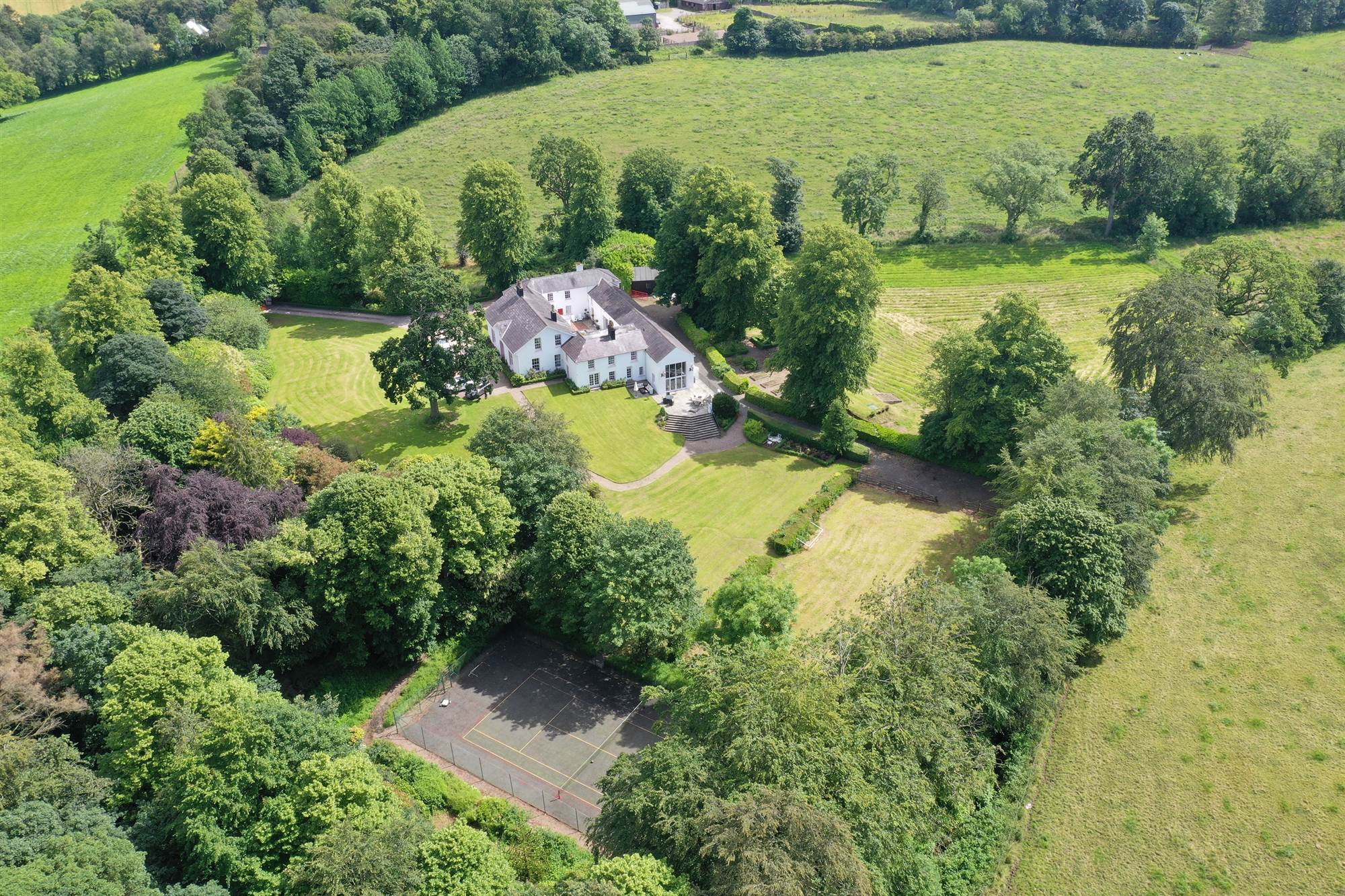 Surrounded by attractive mature country gardens with a woodland back drop providing complete privacy. Rrolling lawns, and a profusion of mature flowers, trees and shrubs, offering colour in all seasons. Large sun terrace accessed from the garden room for afternoon and evening sun. Lower garden area formally a ménage, and all weather tennis court, and wooden pathways around gardens.