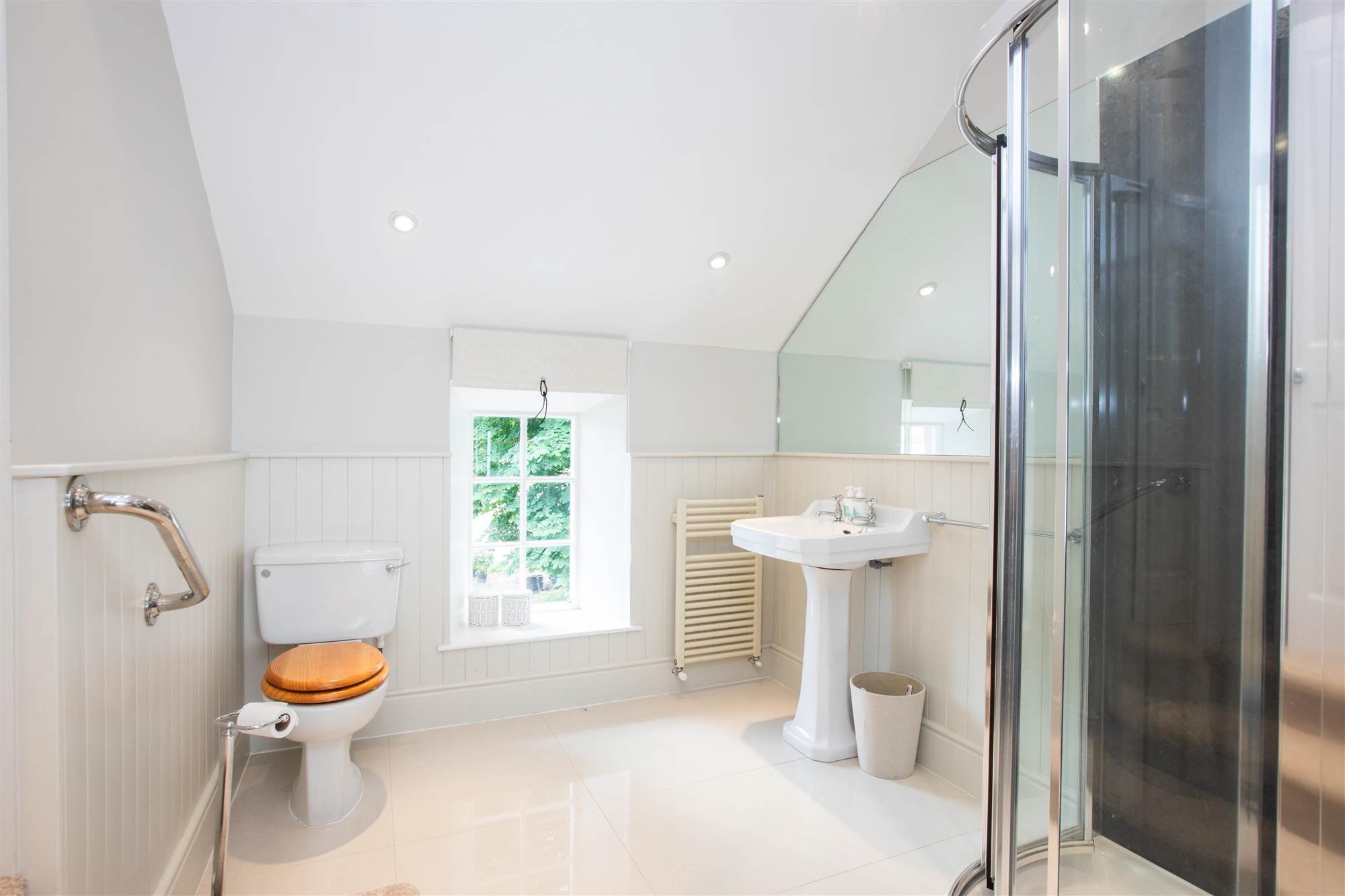 Half panelled walls. Corner shower cubicle. Low flush WC. Pedestal wash hand basin. Wall mirror. Heated towel rail. Fitted shelving. Ceramic tiled floor.