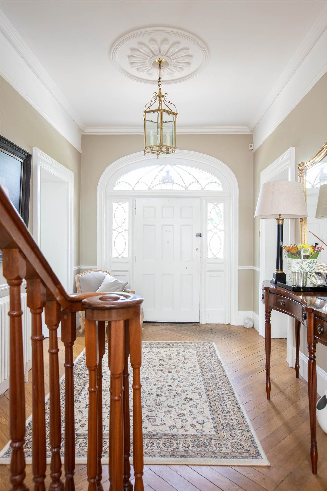 Panelled entrance door with ornate fanlight and side panels. Corniced ceiling. Ceiling rose. Herringbone pattern wood strip floor. Attractive stairway to first floor with mahogany spindles and handrail.