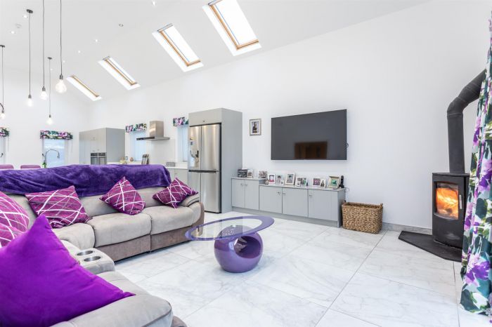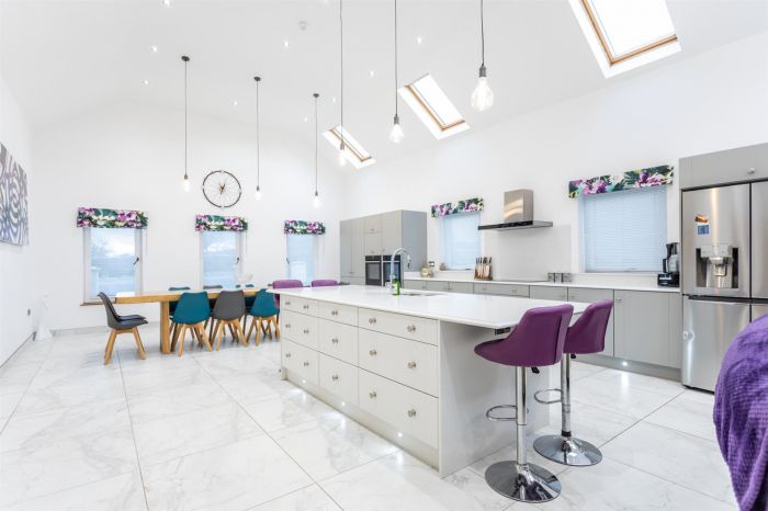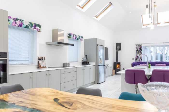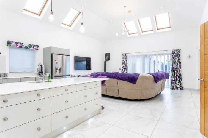 Full range of light grey coloured high and low level units with feature "button" handles and complimentary quartz work surfaces. Center island with double seating to both ends. Quartz work surfaces with inlaid one and a quarter bowl stainless steel sink unit and "Quooker" hot water tap. Integrated five ring halogen hob with feature over head extractor. Mid level double oven. Integrated dish washer. Plumbed for American fridge freezer. Wall mounted TV point. Feature corner glass fronted multi solid fuel free standing cast iron stove with slate hearth. Low voltage down lights. Seven "Keylite" double glazed roof lights. Fully tiled floor and matching skirting. Part glazed double doors to entrance hall. PVC triple glazed sliding patio door to rear. Access to;