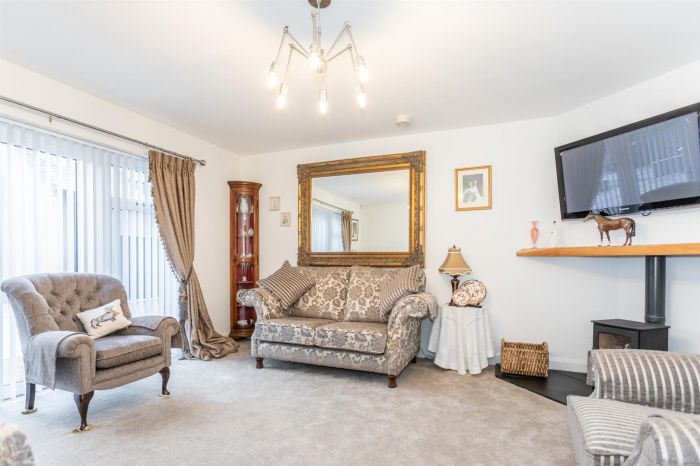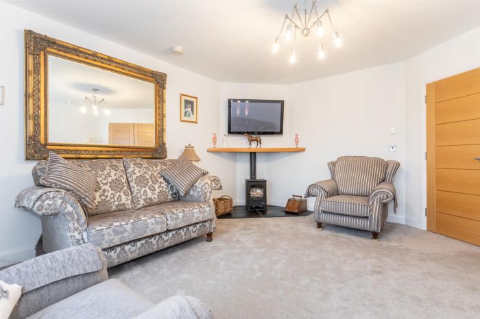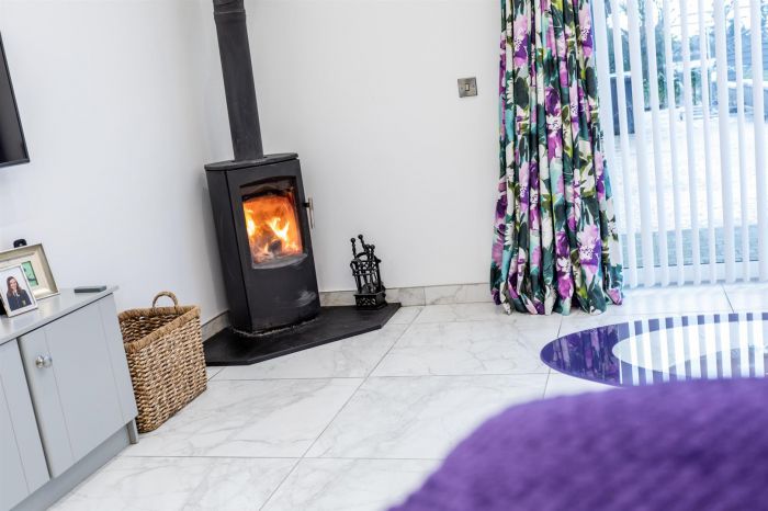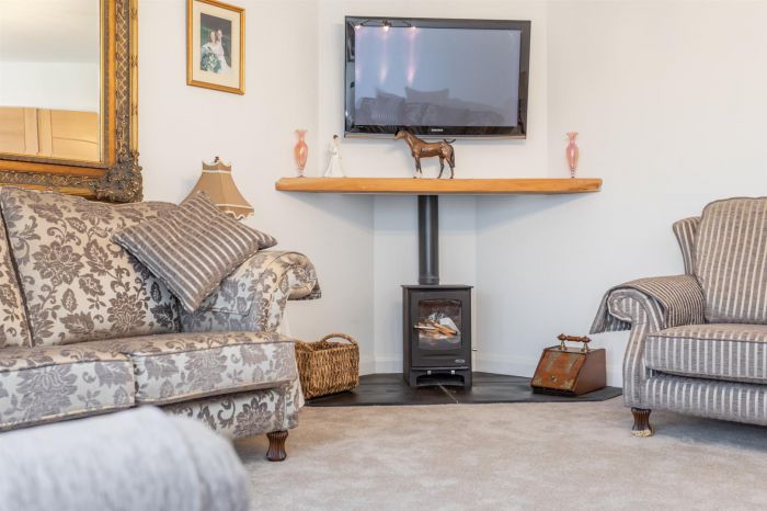 Lounge 15'8 x 14'10 with corner fireplace and free-standing cast iron stove / PVC triple glazed door and matching sidelight to rear / Double doors to Entrance Hall